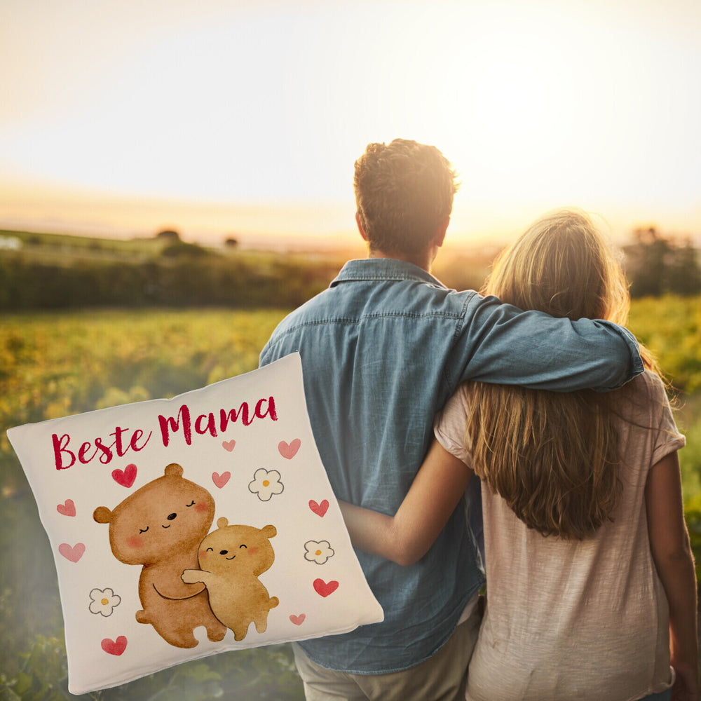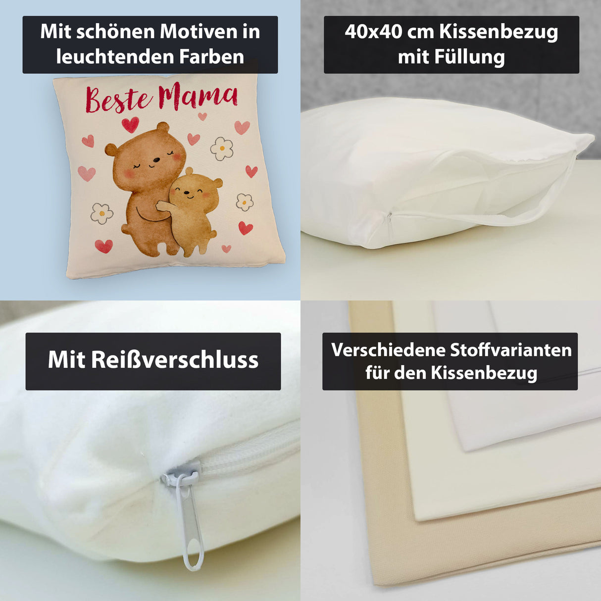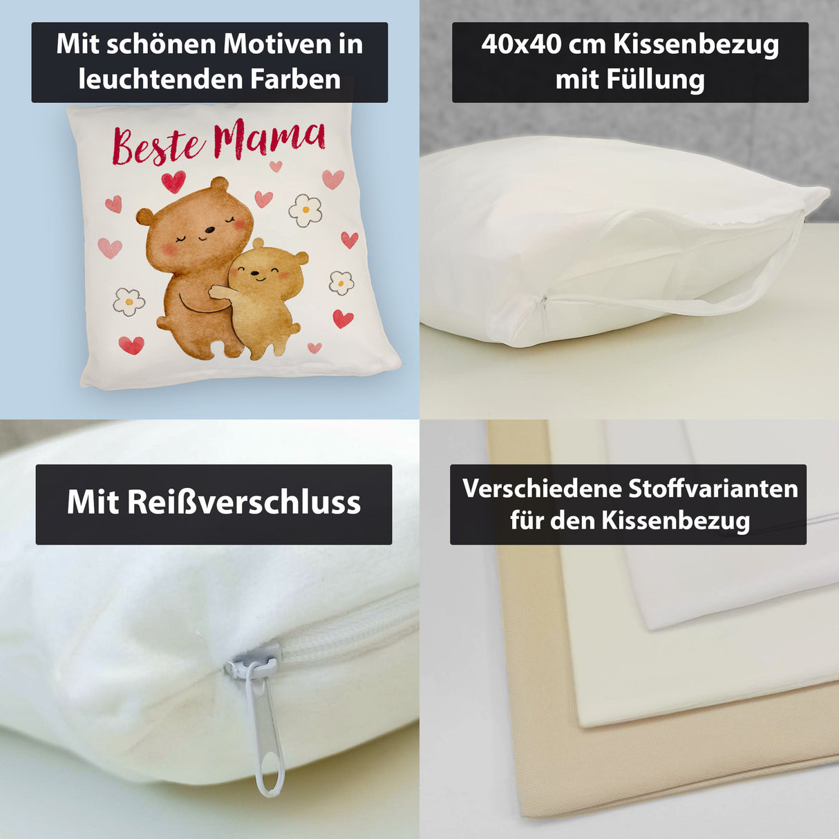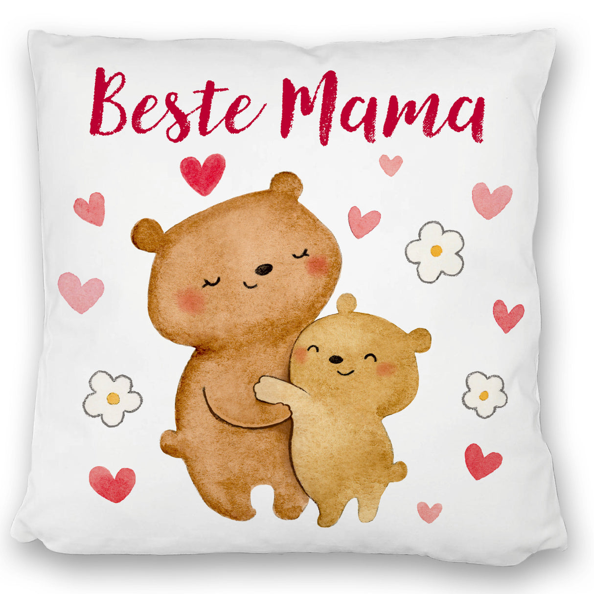 • 1x Bären Mutter und Kind Kissen mit Spruch Beste Mama in der gewählten Ausführung