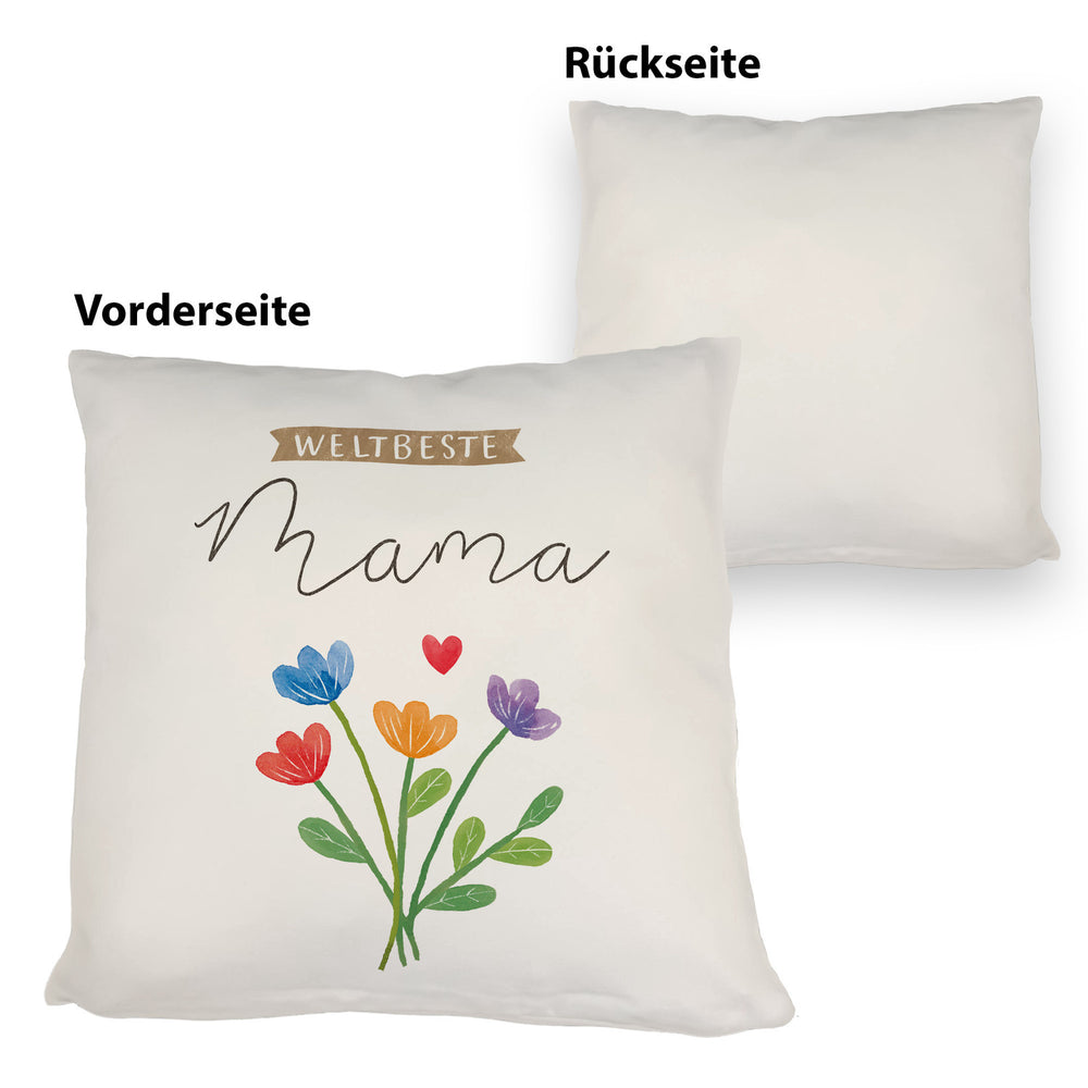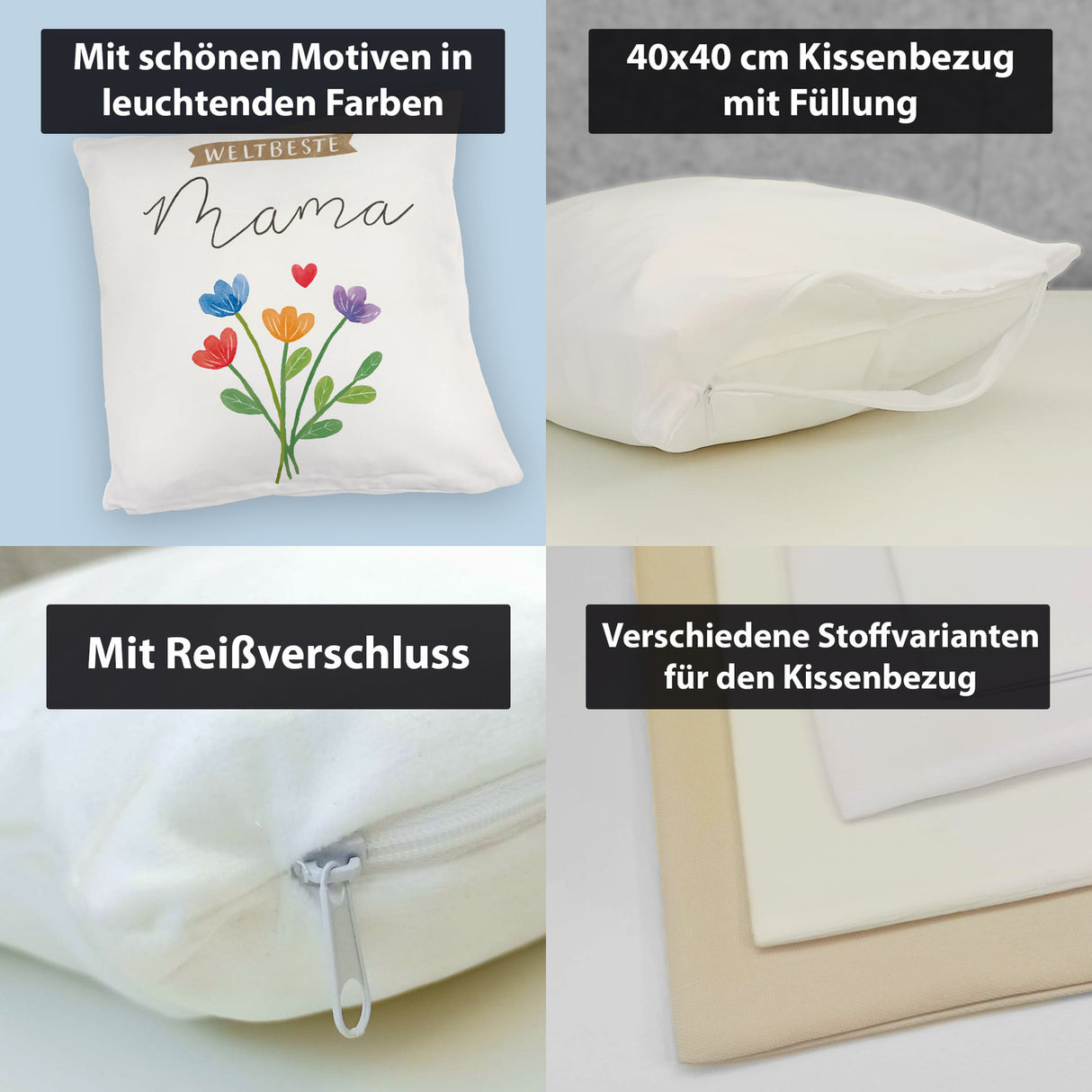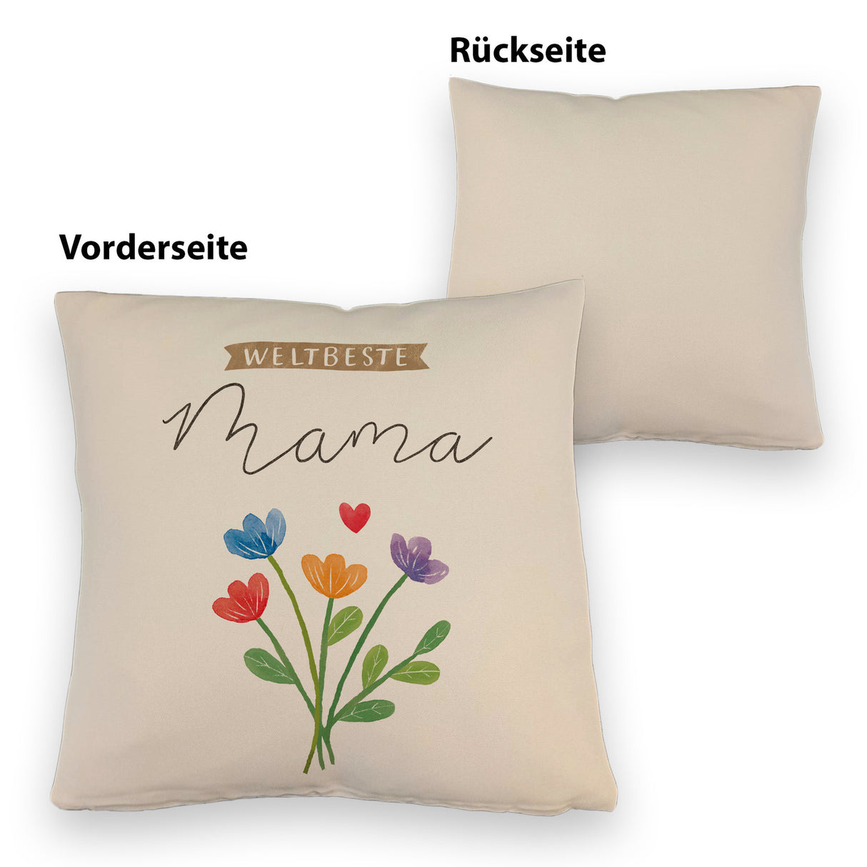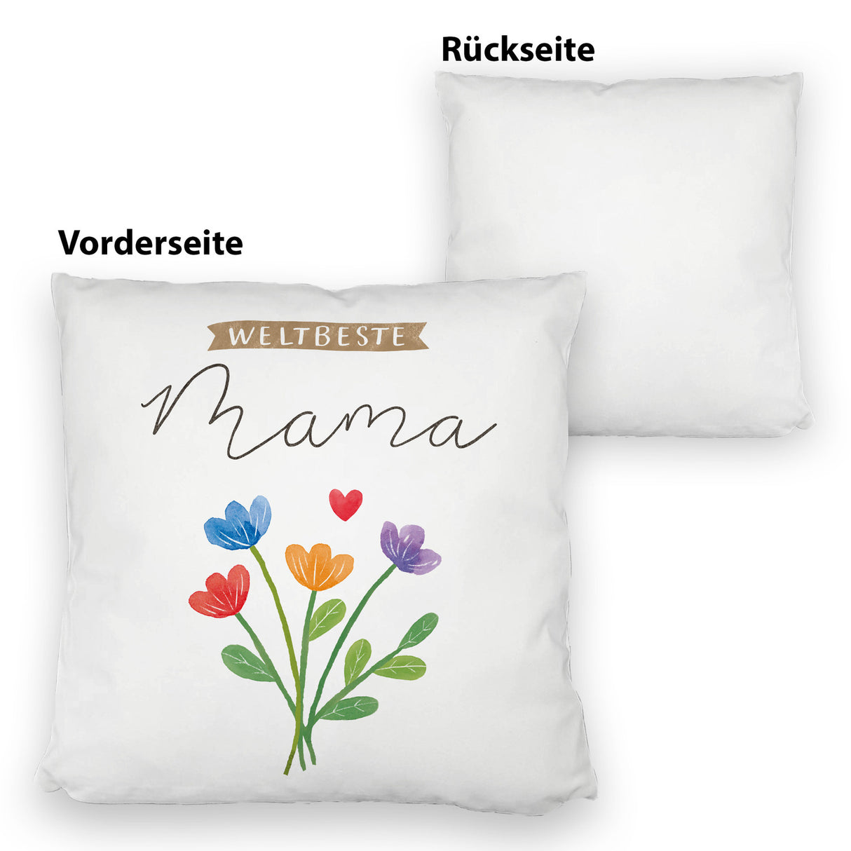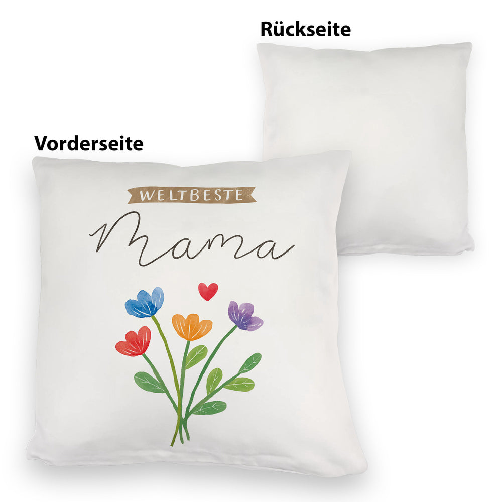 • 1x Blumenstrauß Kissen mit Spruch Weltbeste Mama in der gewählten Ausführung