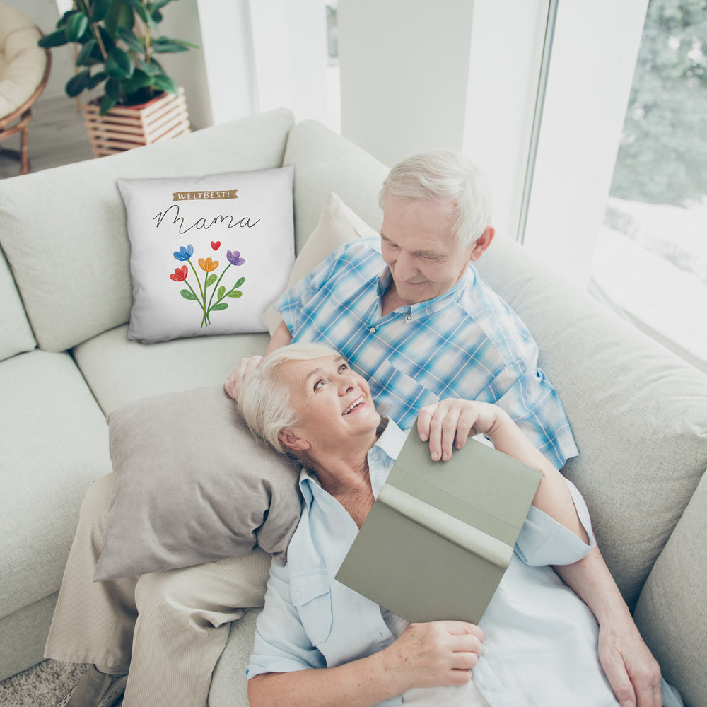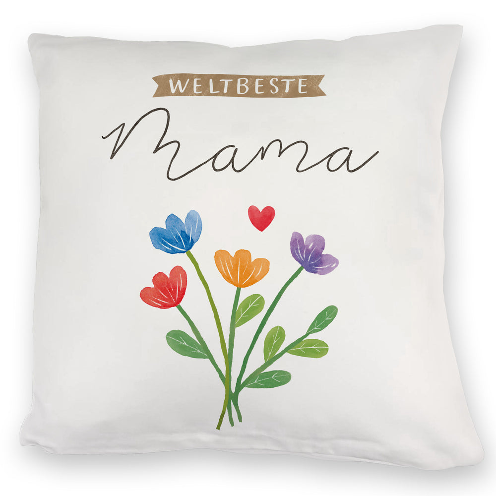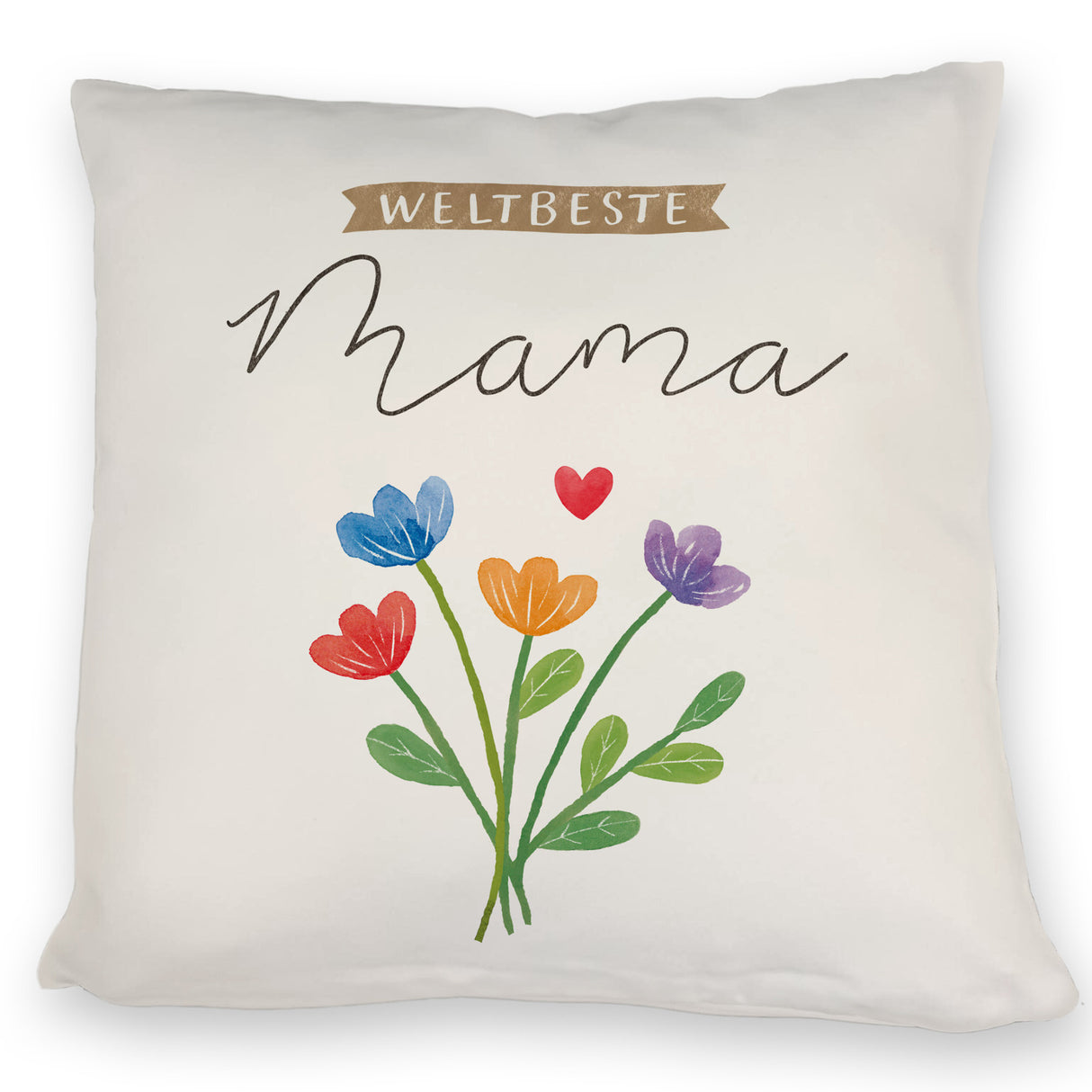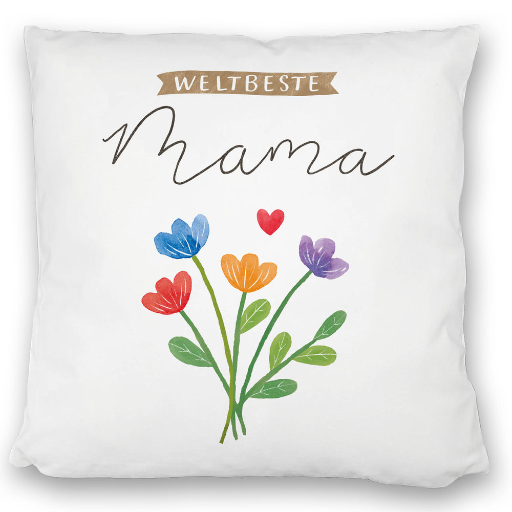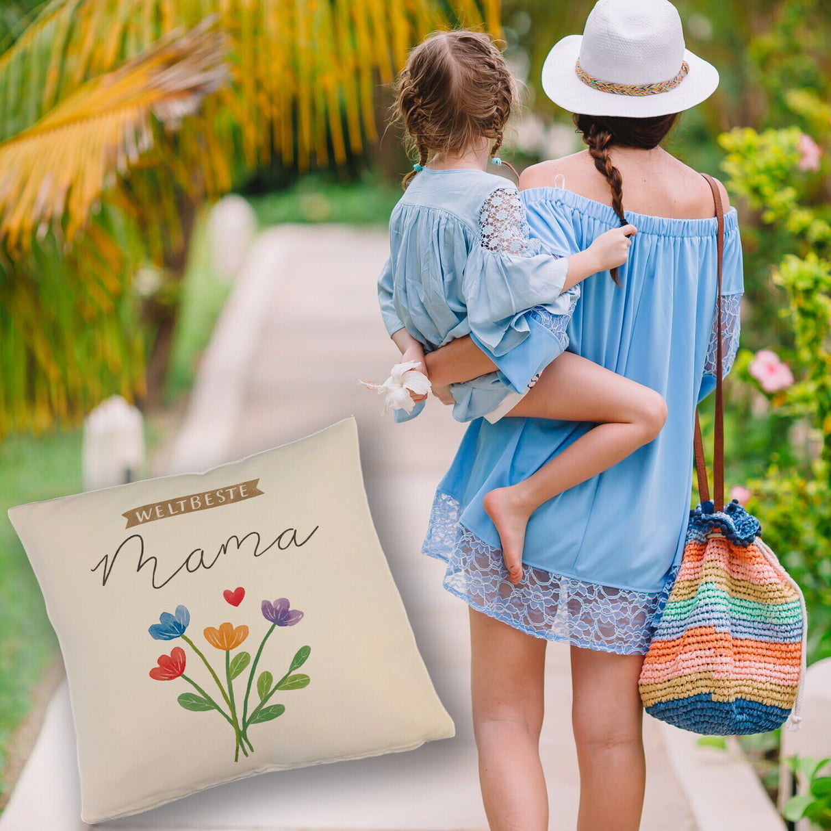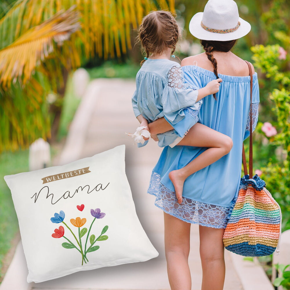 • 1x Blumenstrauß Kissen mit Spruch Weltbeste Mama in der gewählten Ausführung