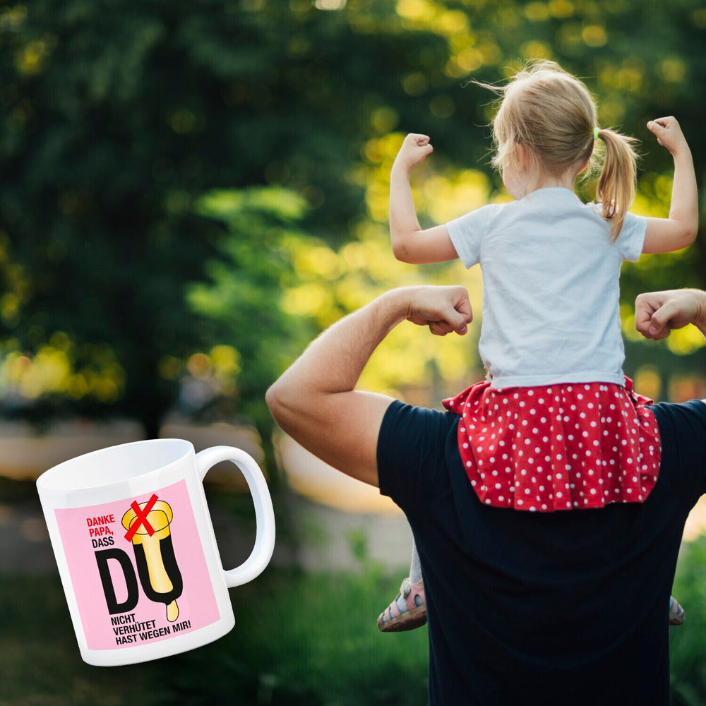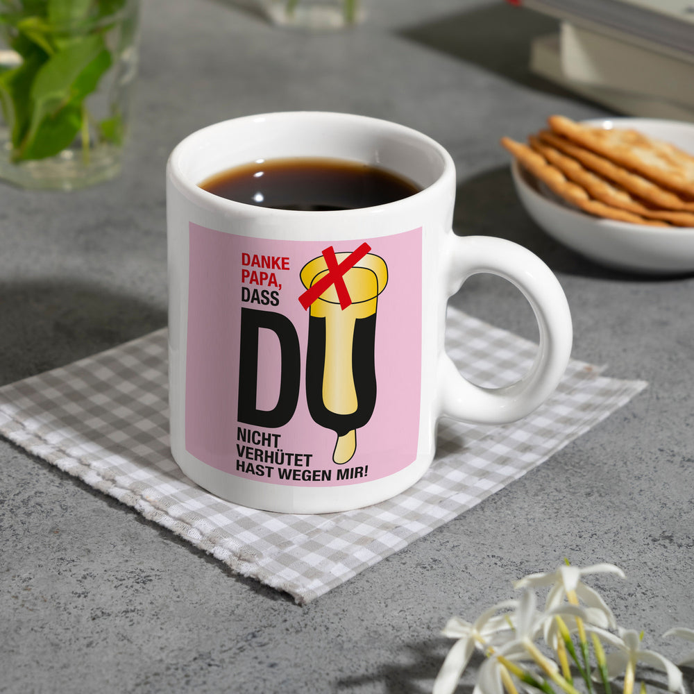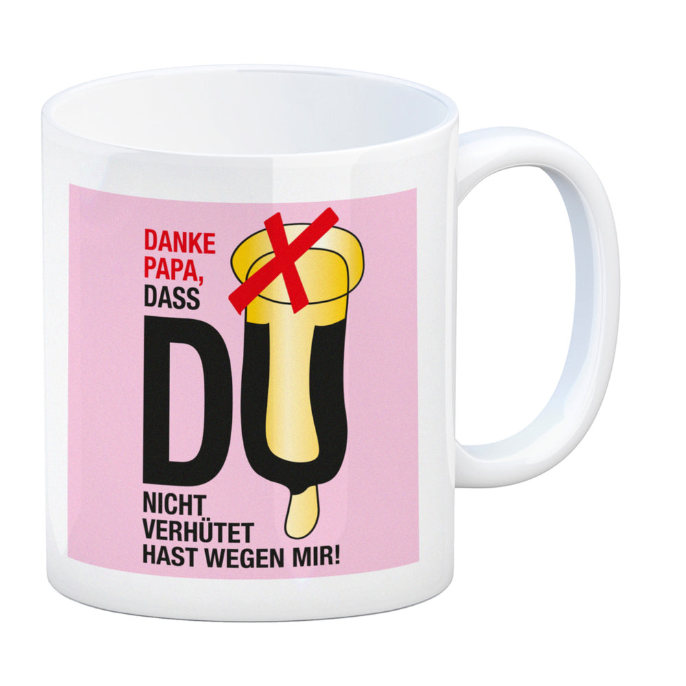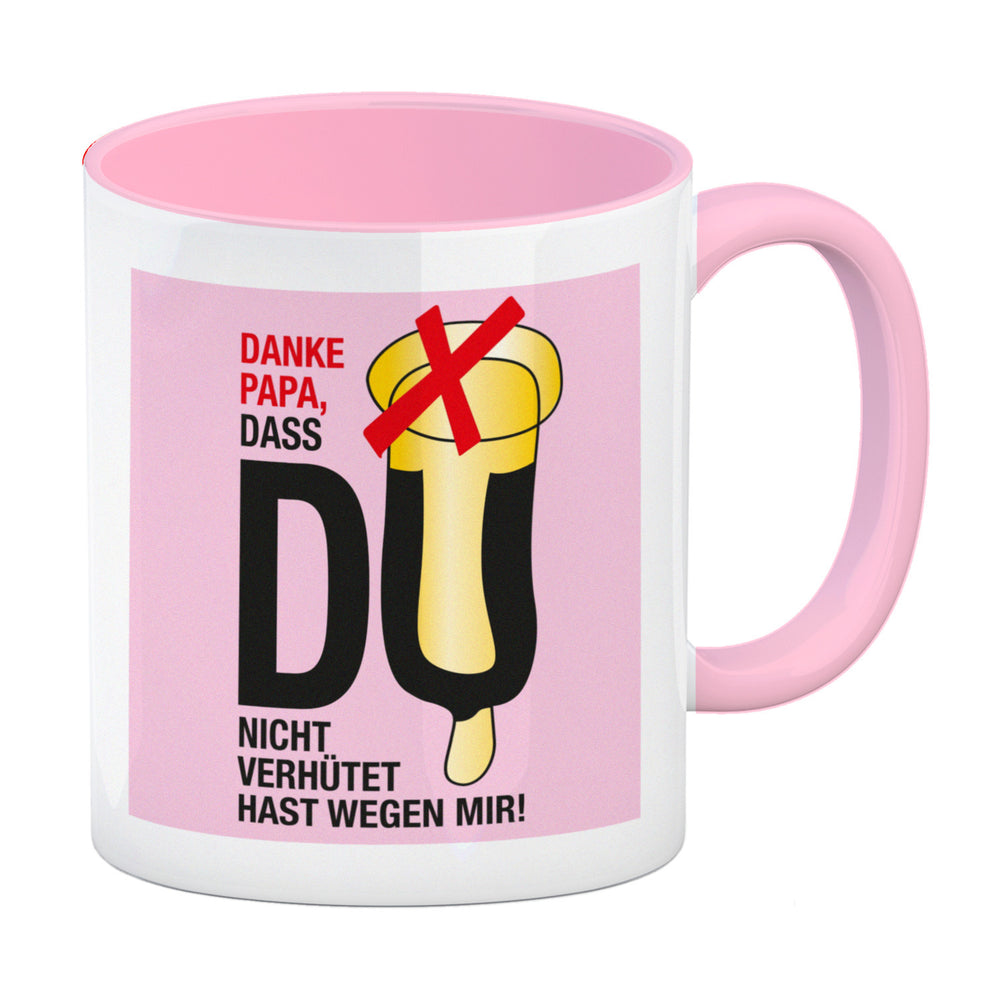 - 1x Danke Papa dass du nicht verhütet hast Kaffeebecher in rosa in der gewählten Ausführung