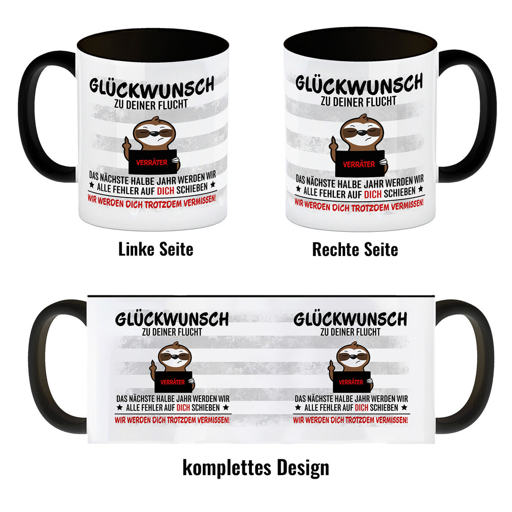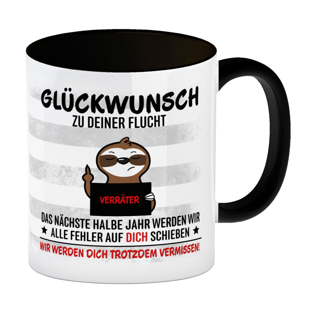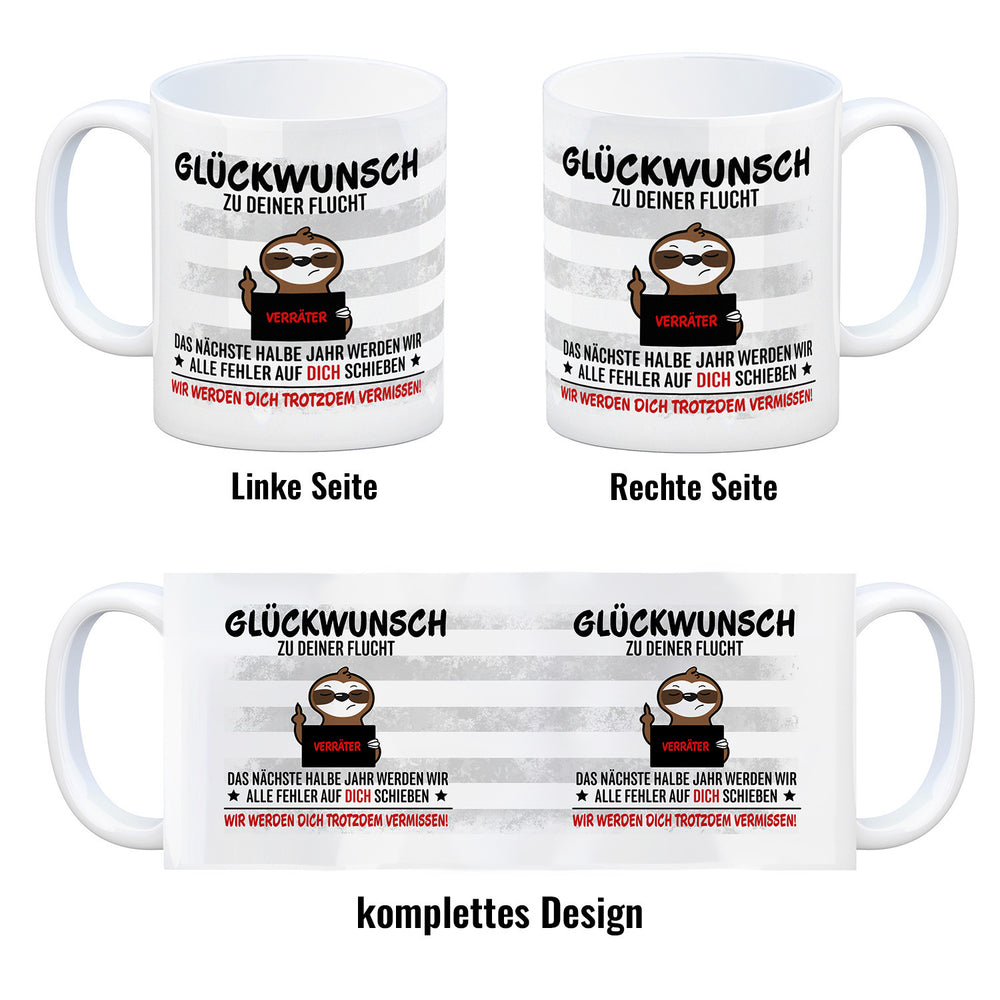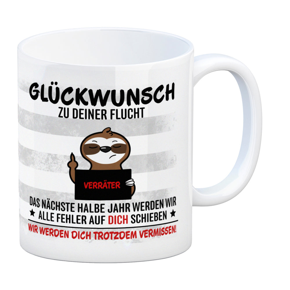 - 1x Glückwunsch zur Flucht, Verräter Mittelfinger Kaffeebecher mit Faultier in der gewählten Ausführung