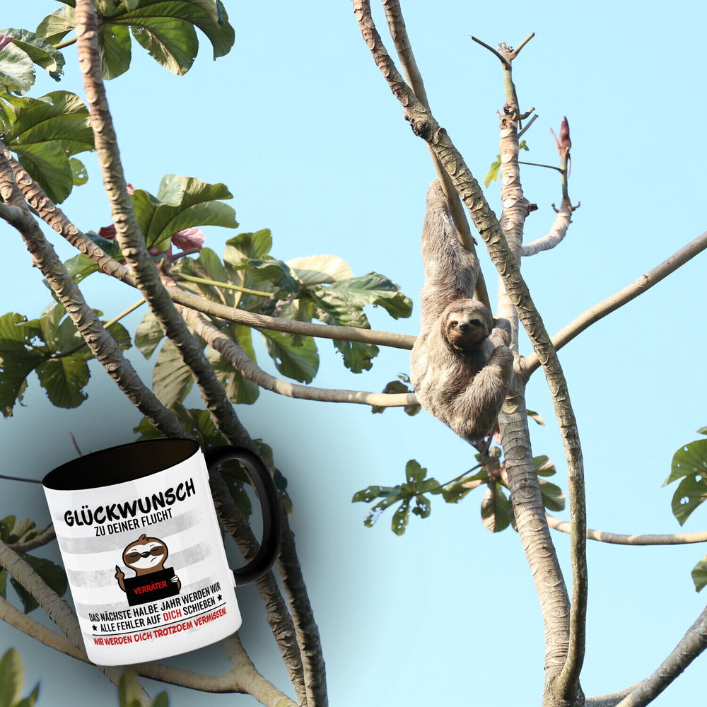Glückwunsch zur Flucht, Verräter Mittelfinger Kaffeebecher mit Faultier