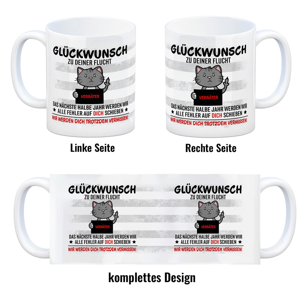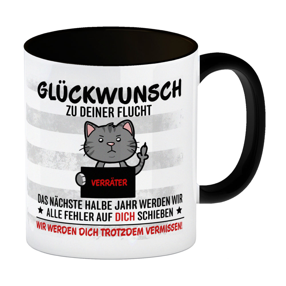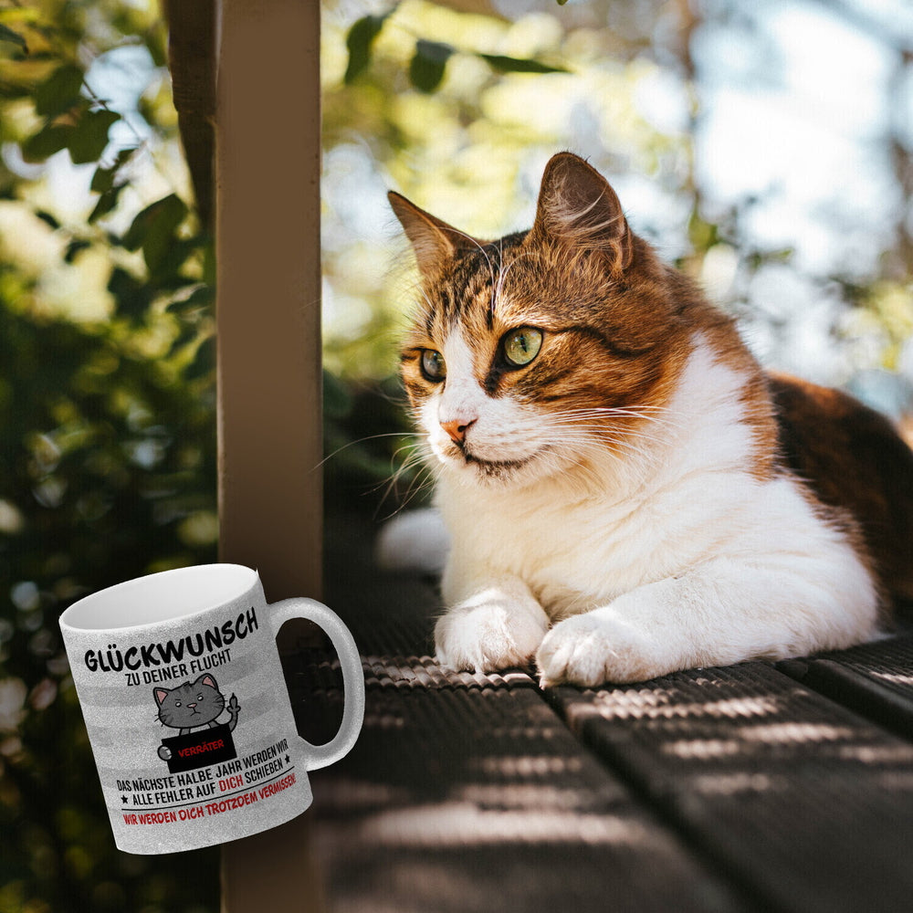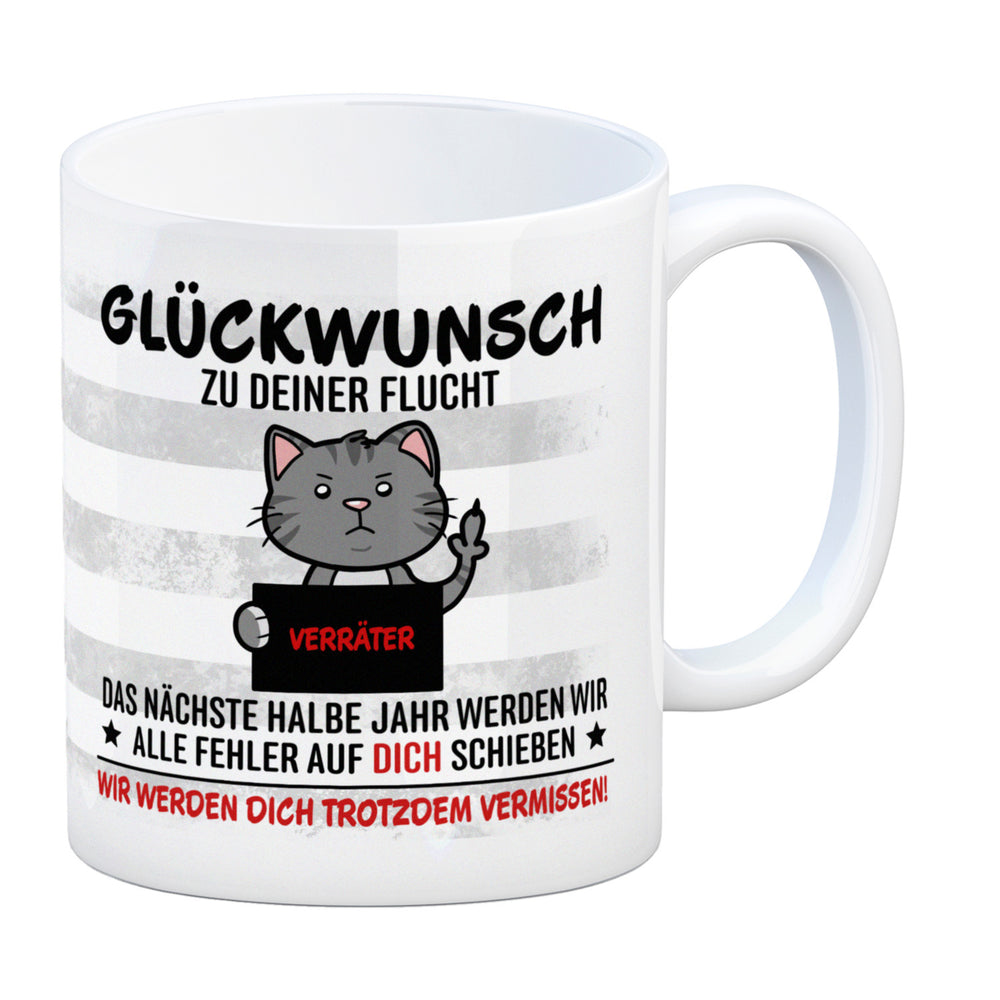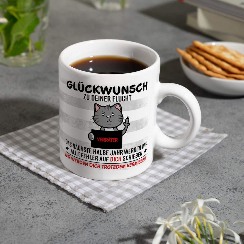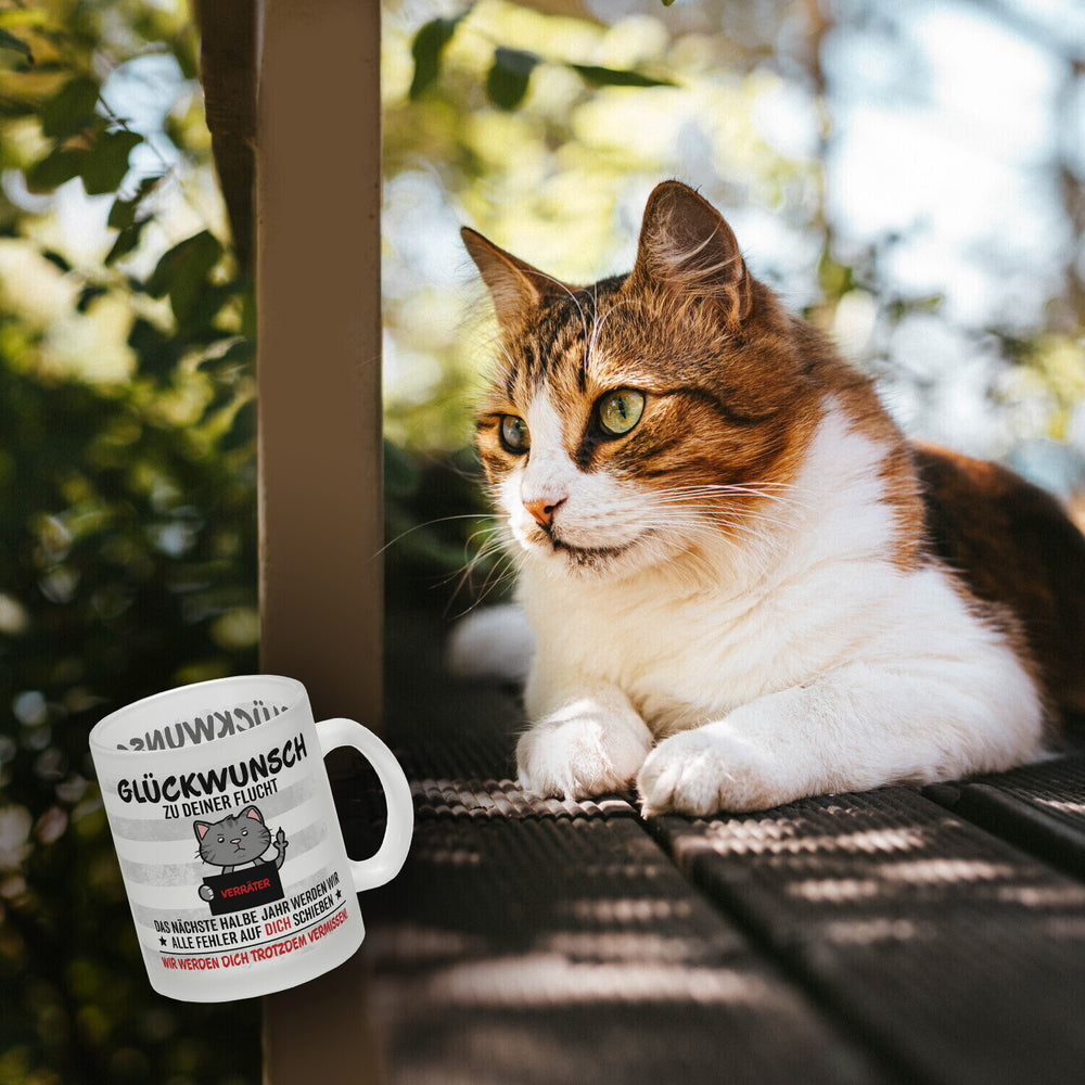 - 1x Glückwunsch zur Flucht, Verräter Mittelfinger Kaffeebecher mit Katze in der gewählten Ausführung
