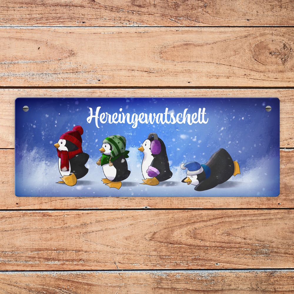 - 1x Hereingewatschelt Metallschild mit vier niedlichen Pinguinen in der gewählten Größe