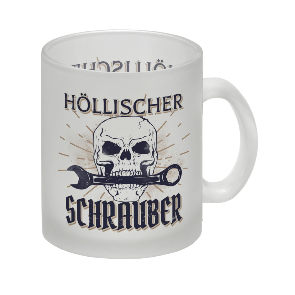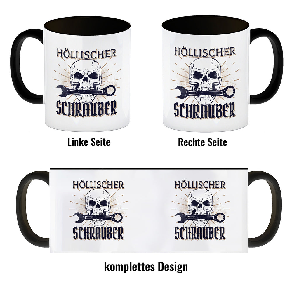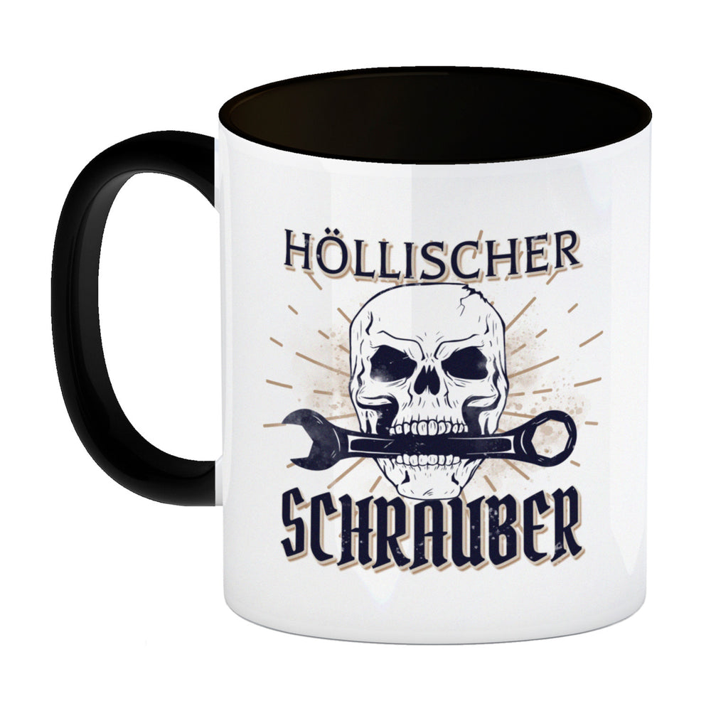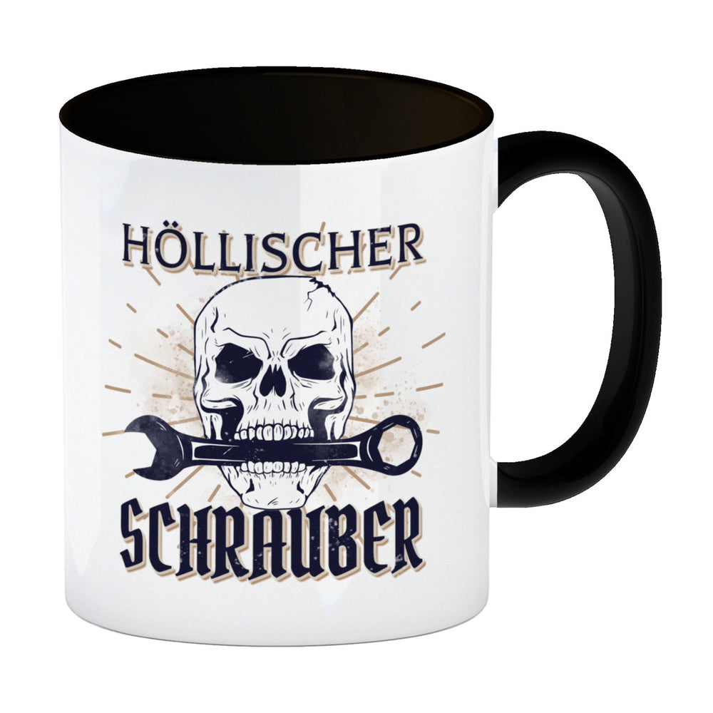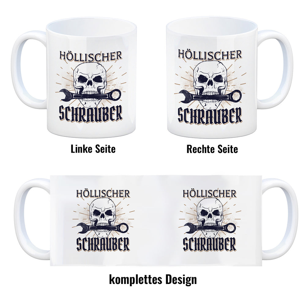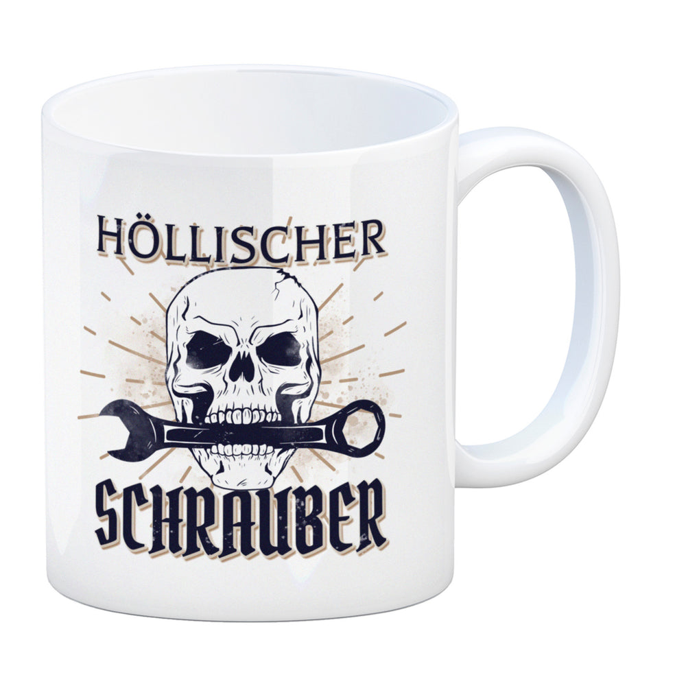- 1x Höllischer Schrauber Kaffeebecher mit Totenkopf und Schraubenschlüssel Motiv in der gewählten Ausführung