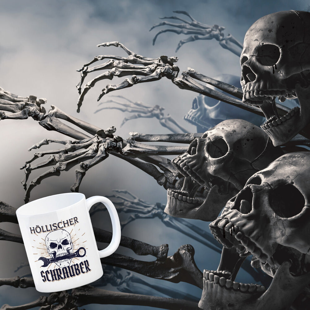 Höllischer Schrauber Kaffeebecher mit Totenkopf und Schraubenschlüssel Motiv