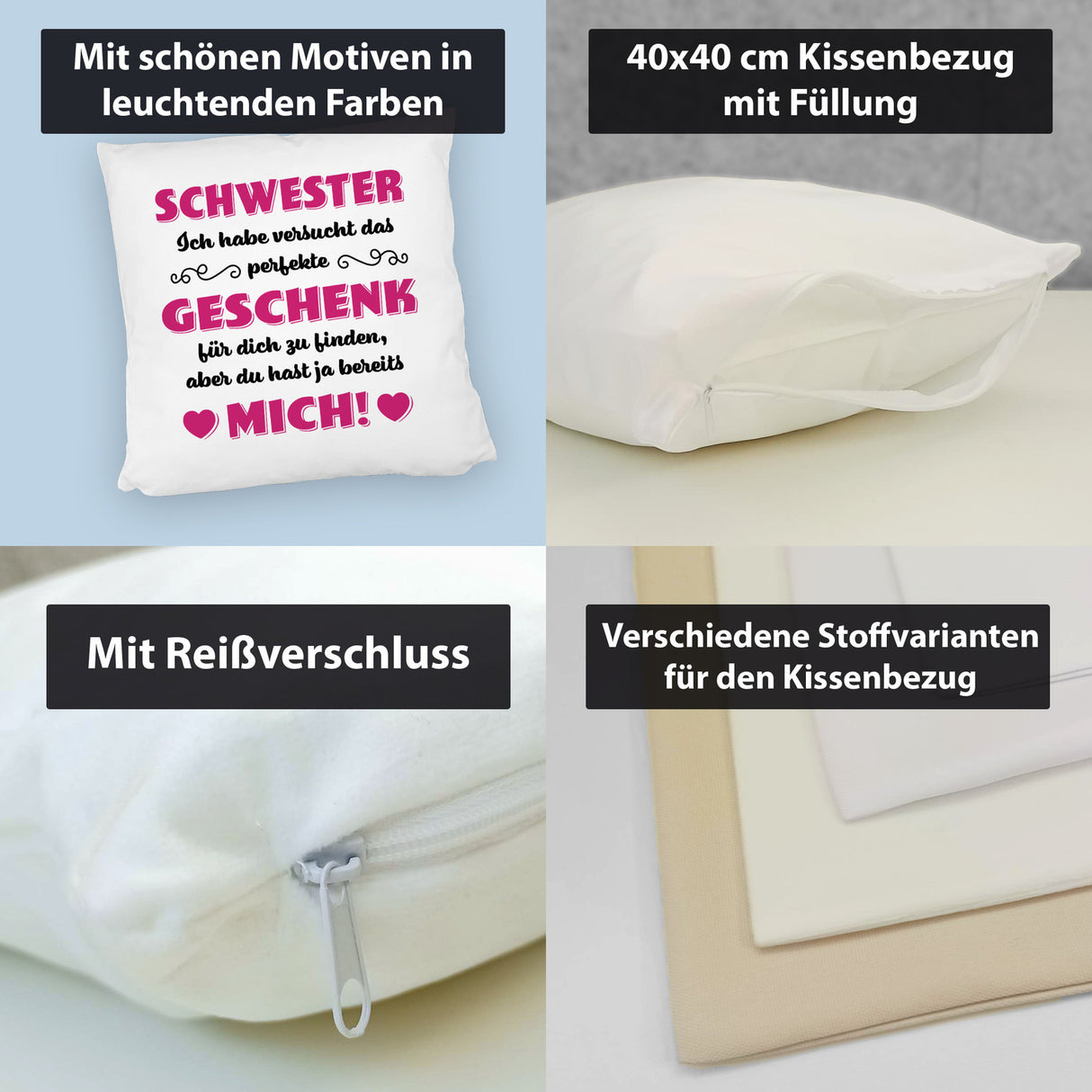 | Schwester/satiniert | ![]() | Material: Polyester / Größe: ca. 40x40 cm / Bezug bei 30° waschbar |