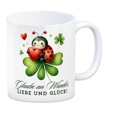 Marienkäfer Kaffeebecher mit Spruch Glaube an Wunder, Liebe und Glück!