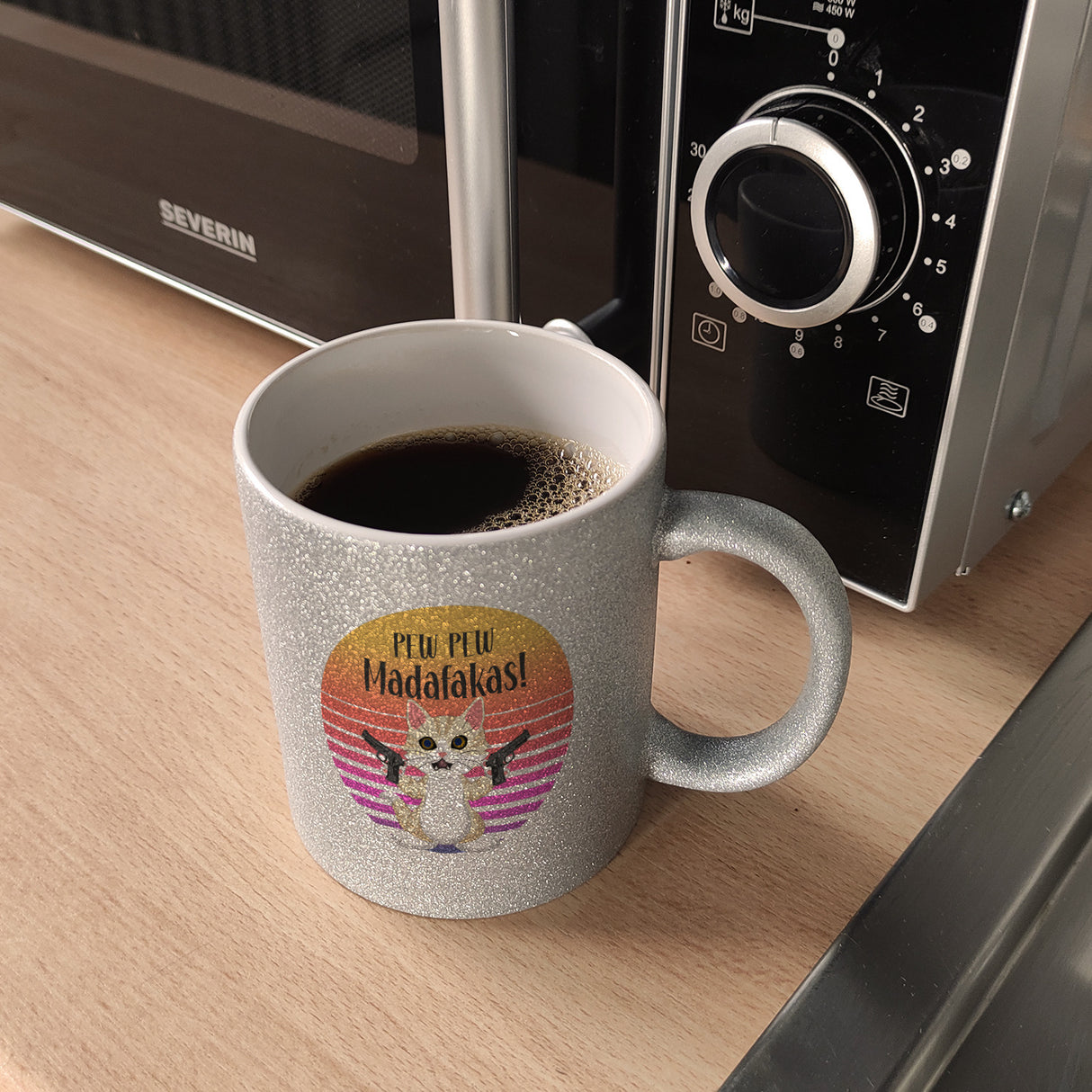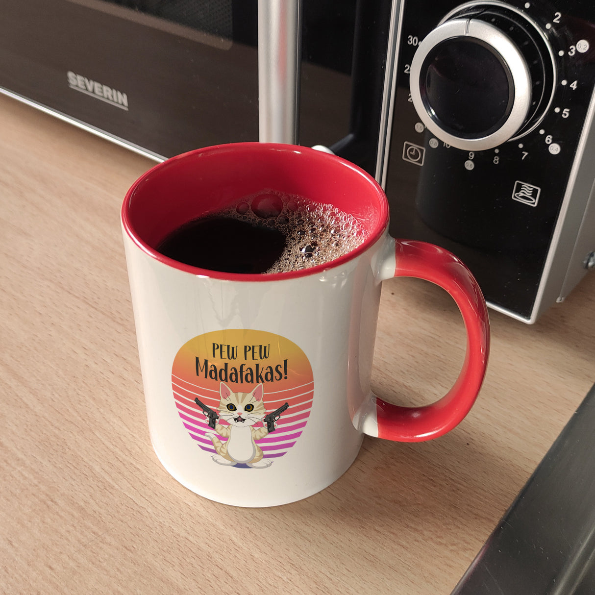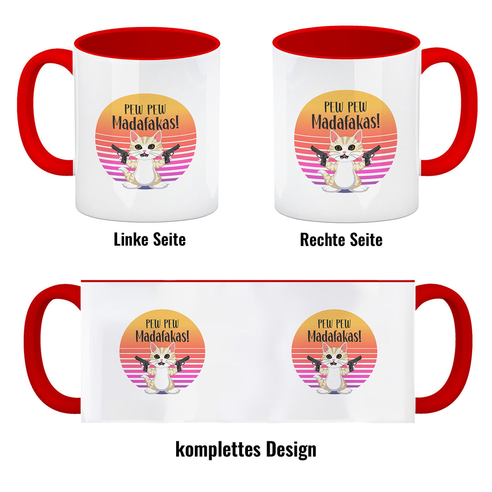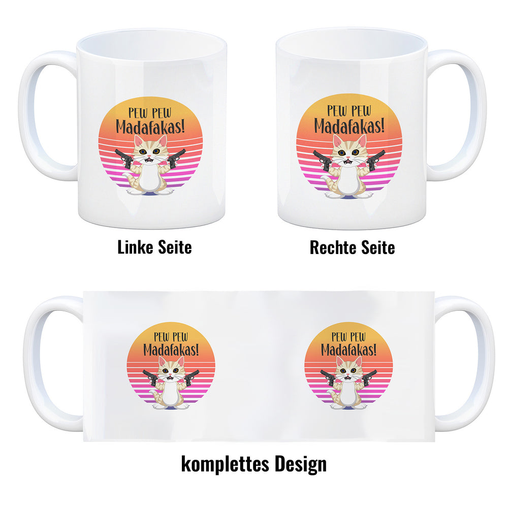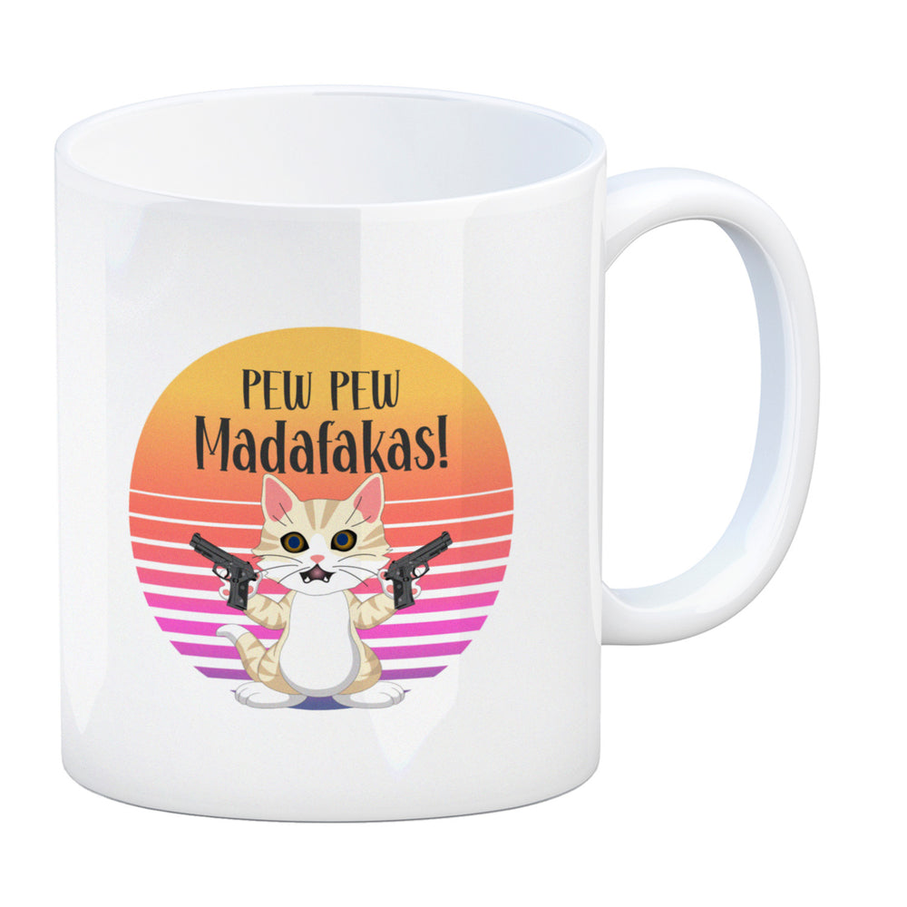 - Dieser Kaffeebecher mit Katzen Motiv ist eine perfekte Geschenkidee für Freunde zum Geburtstag. Mit seinem buntem Retrodesign und dem Spruch PEW PEW Madafakas! Wird er das Herz jedes Katzenliebhabers höher schlagen lassen.