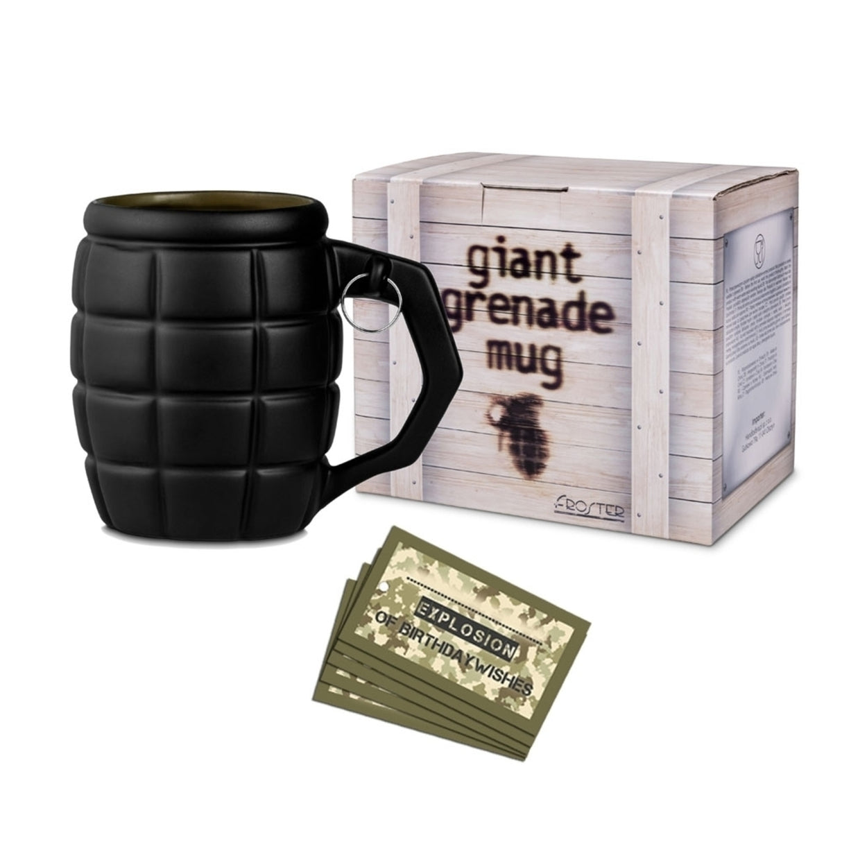 - Lieferumfang: 1x XXL Handgranate Kaffeebecher bestehend aus 1x Tasse und 5x Grußkarten.