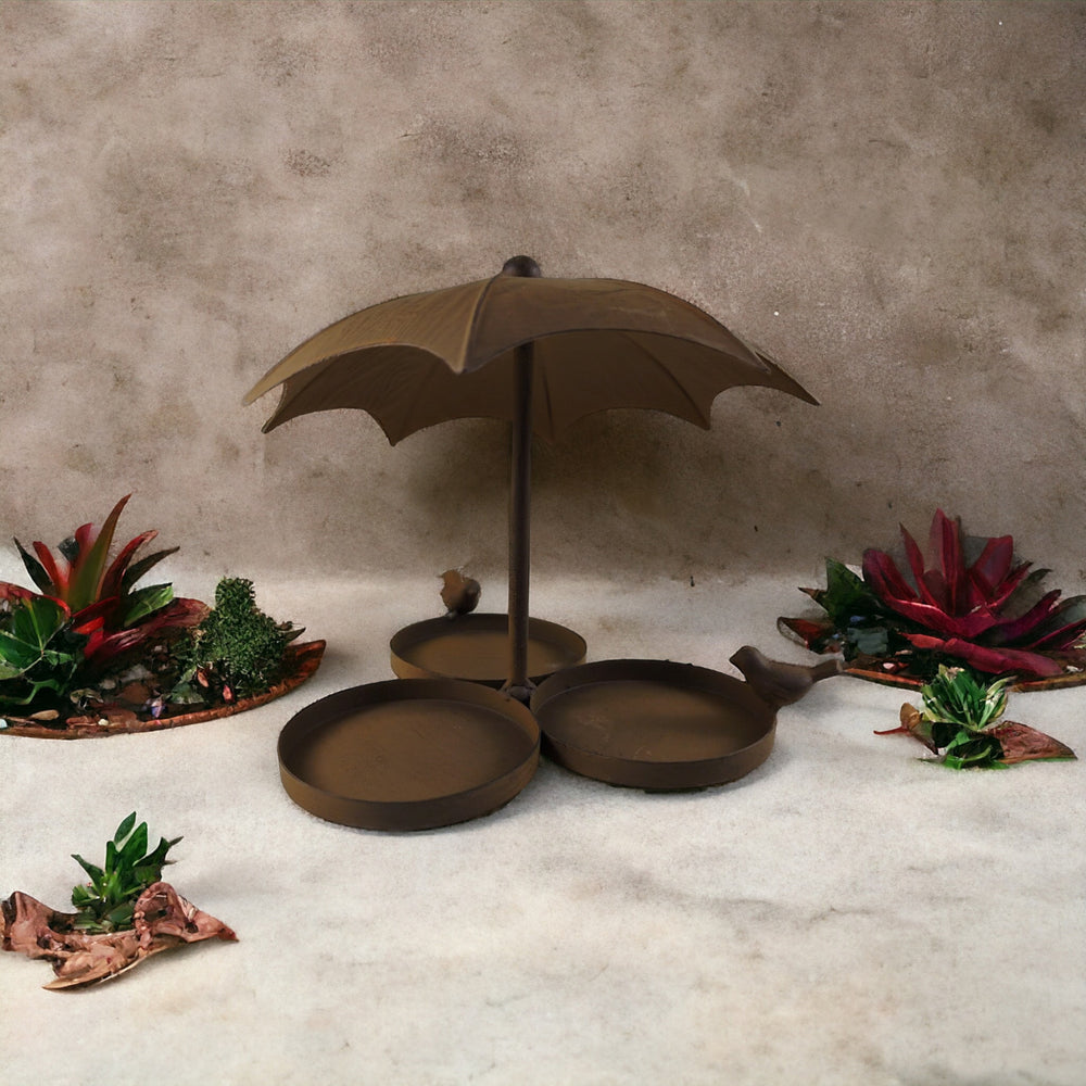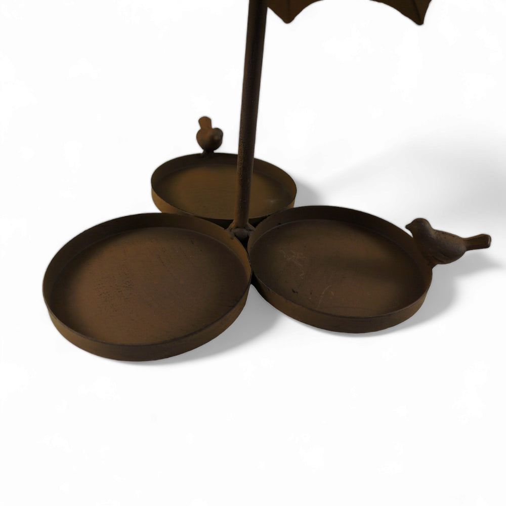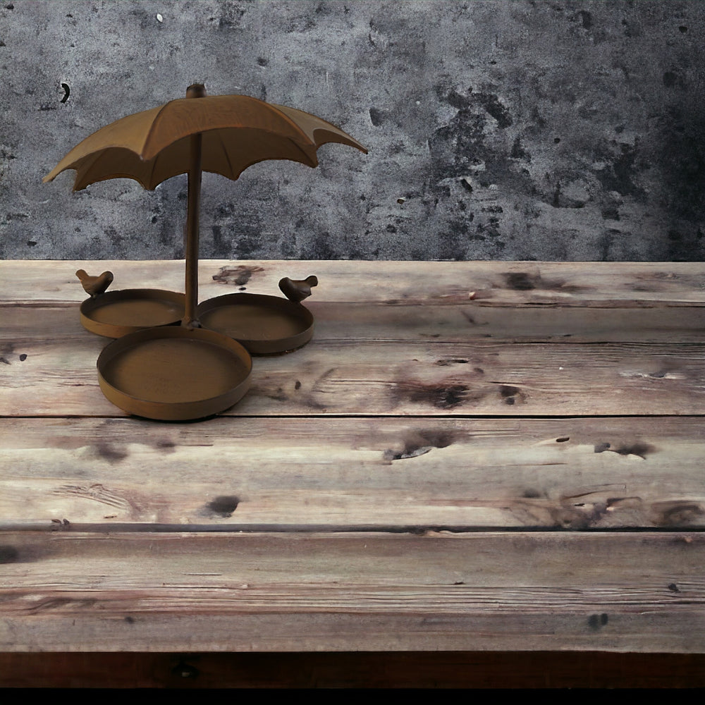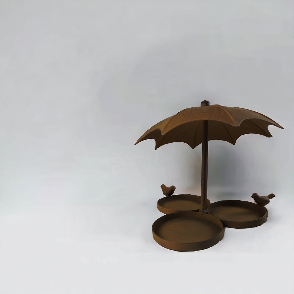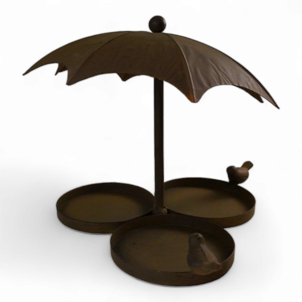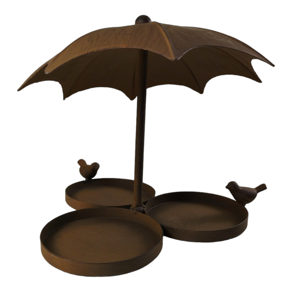 - In rustikaler Rostoptik schwingt unser Metall-Regenschirm schützend über drei Futter- und Wasserschalen. Zwei niedliche Vogelfiguren stehen bereits Schlange und demonstrieren den Piepmätzen: Hier ist das Gourmet-Buffet eröffnet – frostsicher, winterfest und ein Schmaus für's Auge!