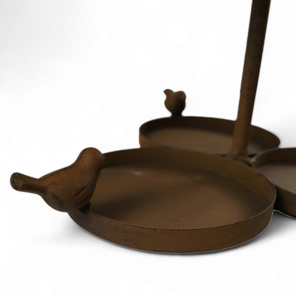 - 1x Vogelhaus Futterstation Vögel Wassertränke mit Drei Futterplätzen aus Metall in Rostoptik.
