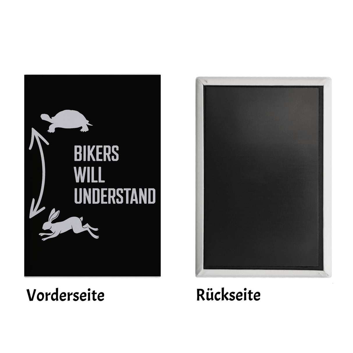 Der eckige Souvenir-Magnet zeigt ein lustiges Design mit einer Schildkröte und einem Hasen auf schwarzem Hintergrund. Die Silhouetten der Tiere werden von einem geschwungenen Doppelpfeil begleitet. In silberner Schrift steht: "Bikers will understand&q Hinweise: Größe: ca. 8x5,5 cm