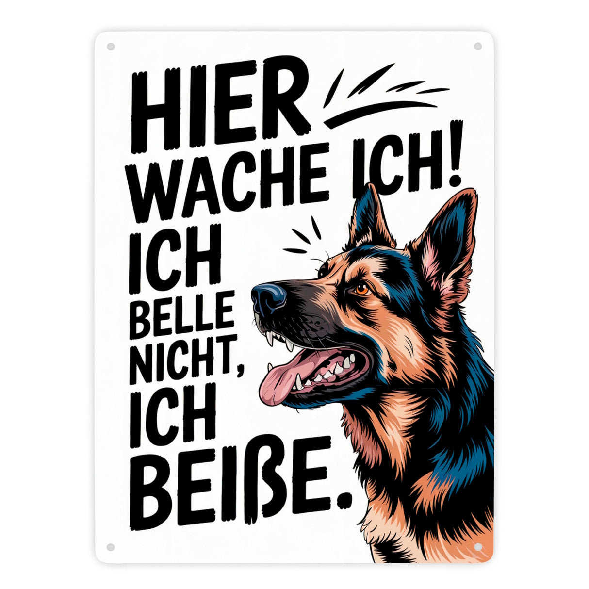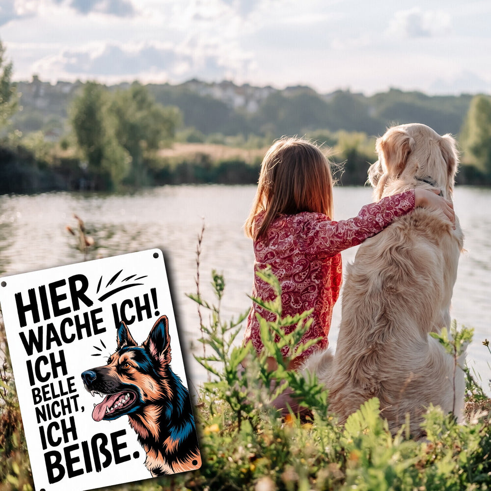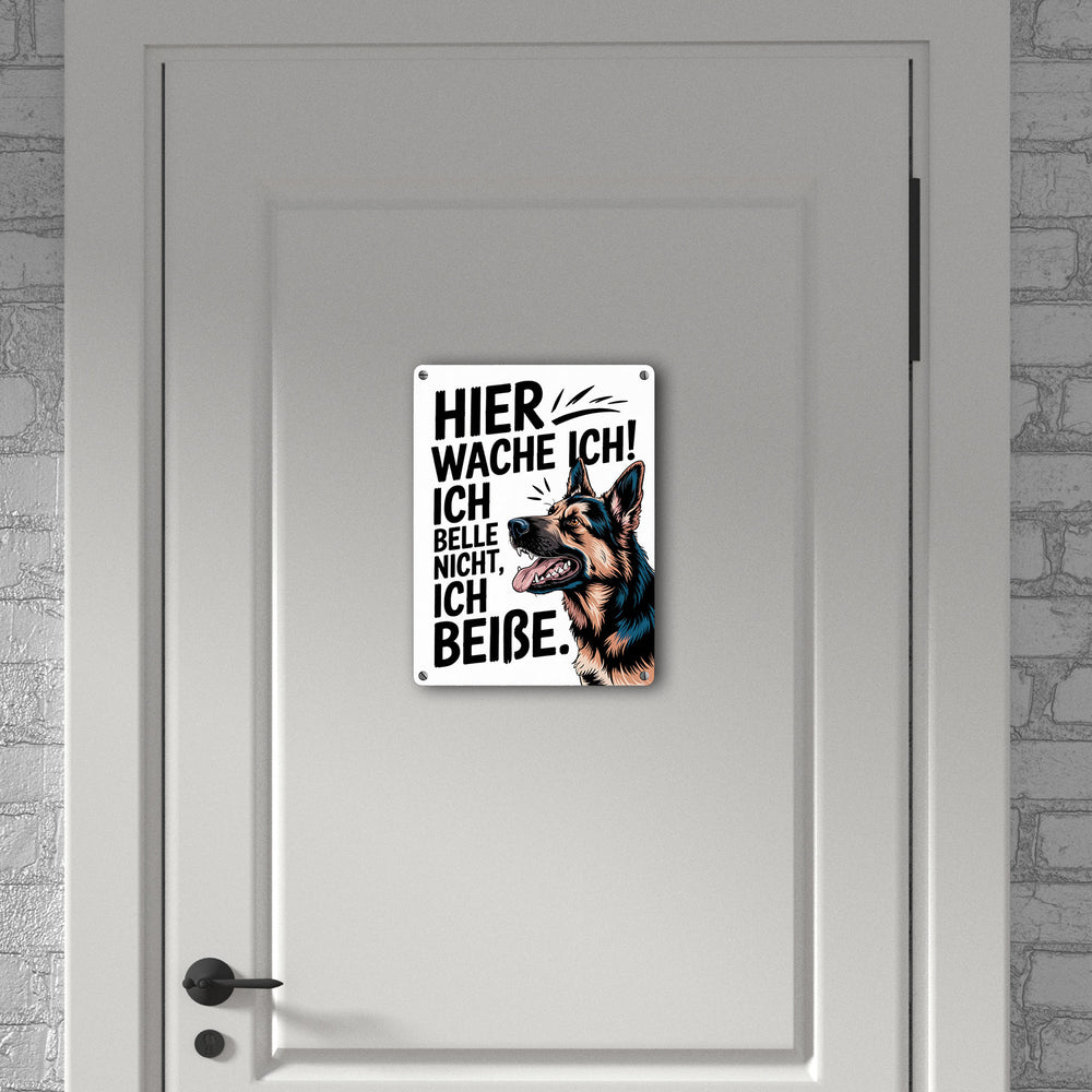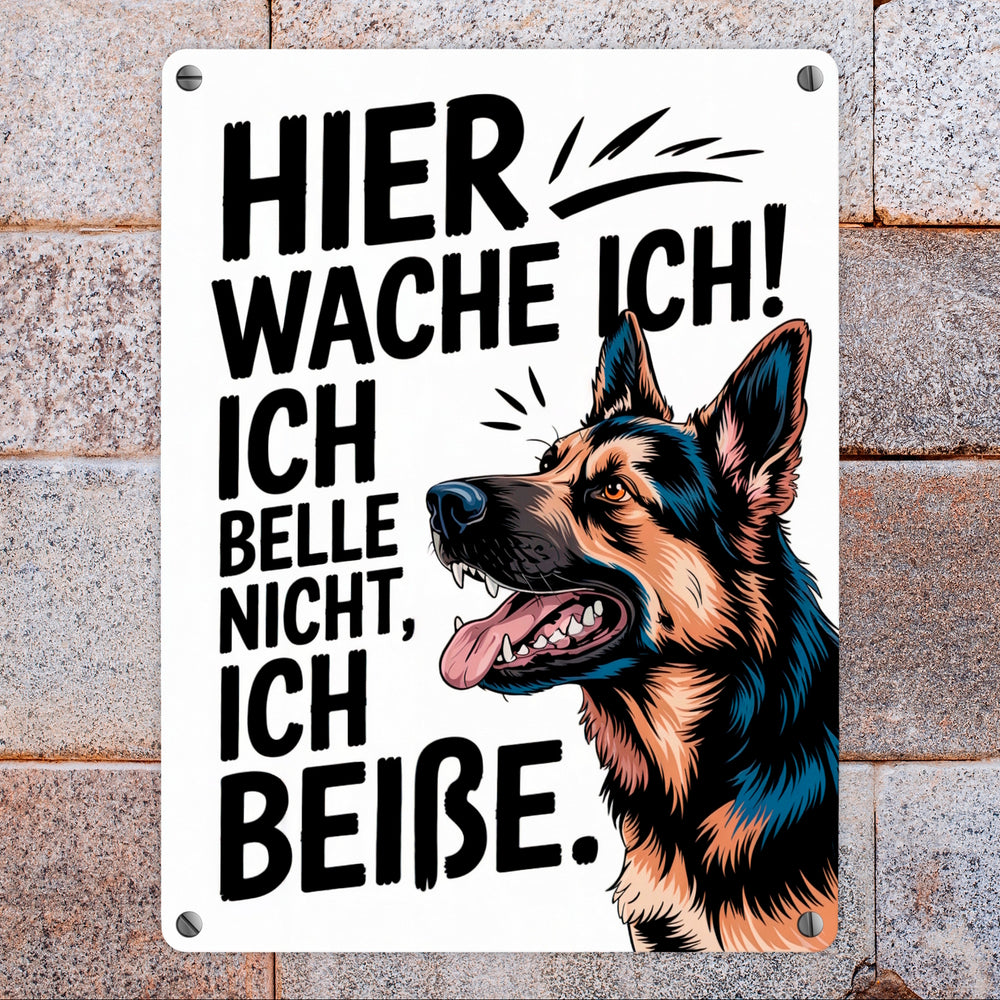 - Dieses Metallschild bringt jeden zum Schmunzeln! Auf weißem Hintergrund zeigt sich der majestätische Deutsche Schäferhund im Seitenprofil, mit spielerischem Ausdruck, ausgefahrenen Zähnen und Pfiff in den Ohren. Der markante Spruch „Hier wache ich! Ich belle nicht, ich beiße.“ zieht alle Blicke auf sich und sorgt für Lacher.