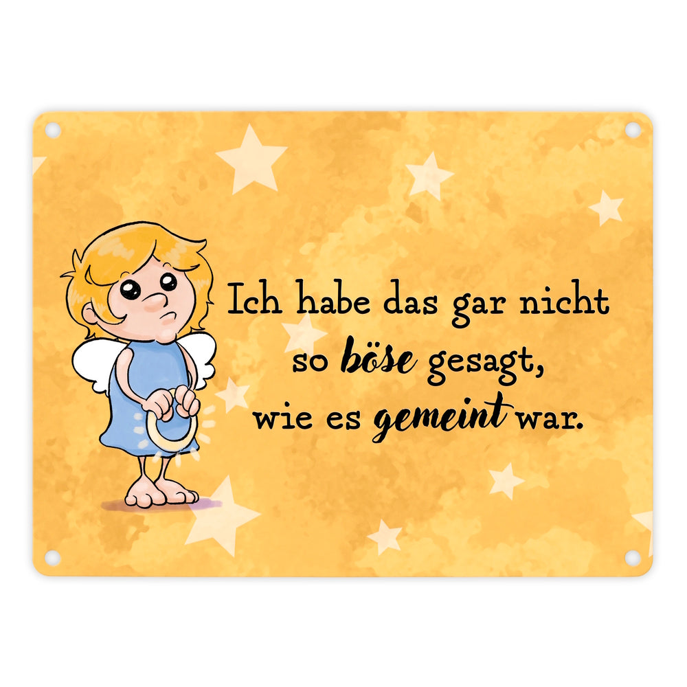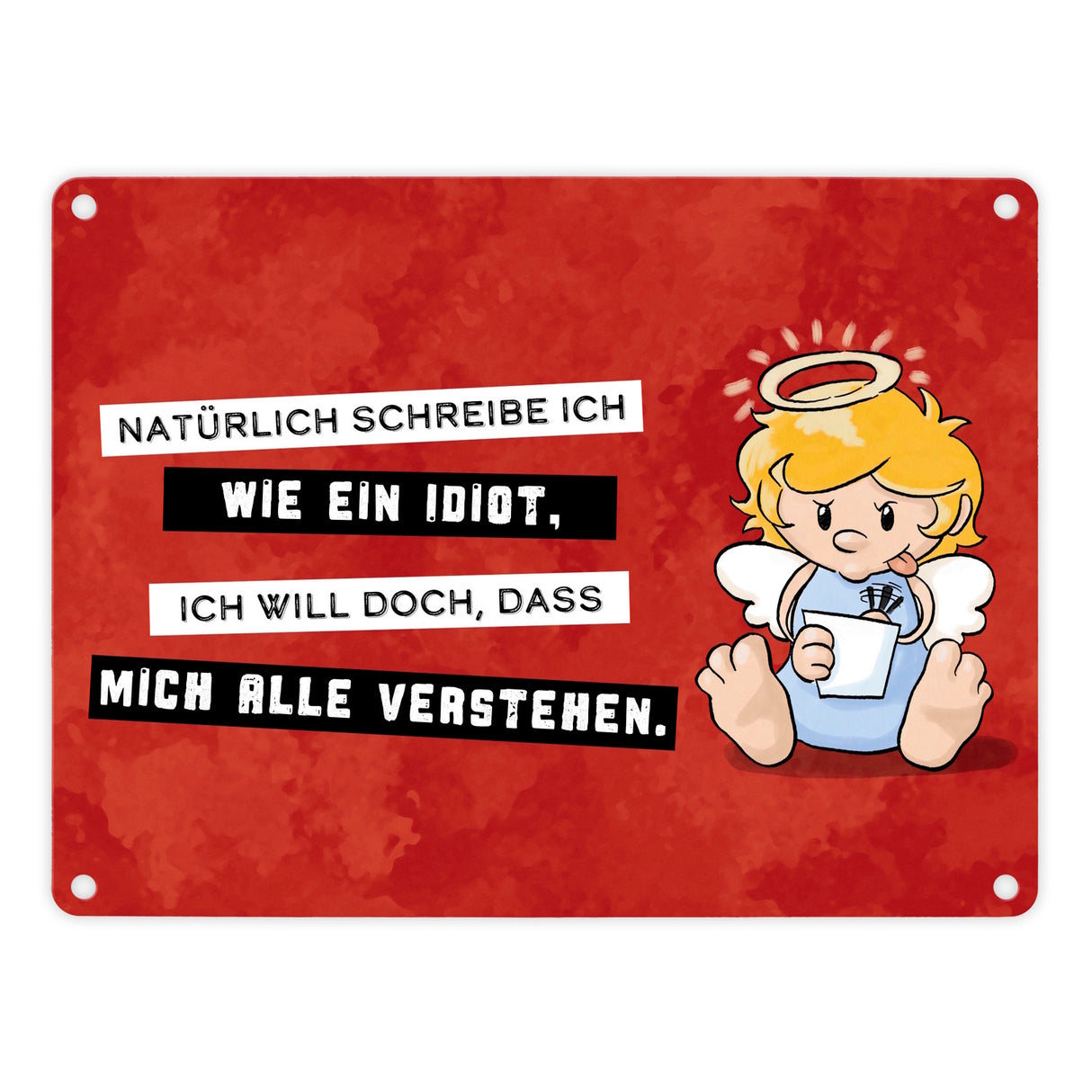 Bringen Sie ein bisschen Witz und Humor in Ihre vier Wände! Dieses Engel Metallschild in 15x20 cm ist die perfekte Geschenkidee für Scherzkekse zum Geburtstag. Ein neckisches Engelmotiv mit Brille und Buch, begleitet vom Spruch: Ich spreche fließend Ironie, und das sogar mit sarkastischem Akzent, verschönert jeden Eingang und jeden Schreibtisch. Aus hochwertigem Aluminiumblech gefertigt, mit vorgebohrten Löchern und abgerundeten Ecken. Natürlich wird das Metallschild in Deutschland in Handarbeit hergestellt. Erhältlich in den Größen 15x20cm, 21x28cm und 28x38cm. Schenken Sie ein Lächeln - schenken Sie ein Engel Metallschild!