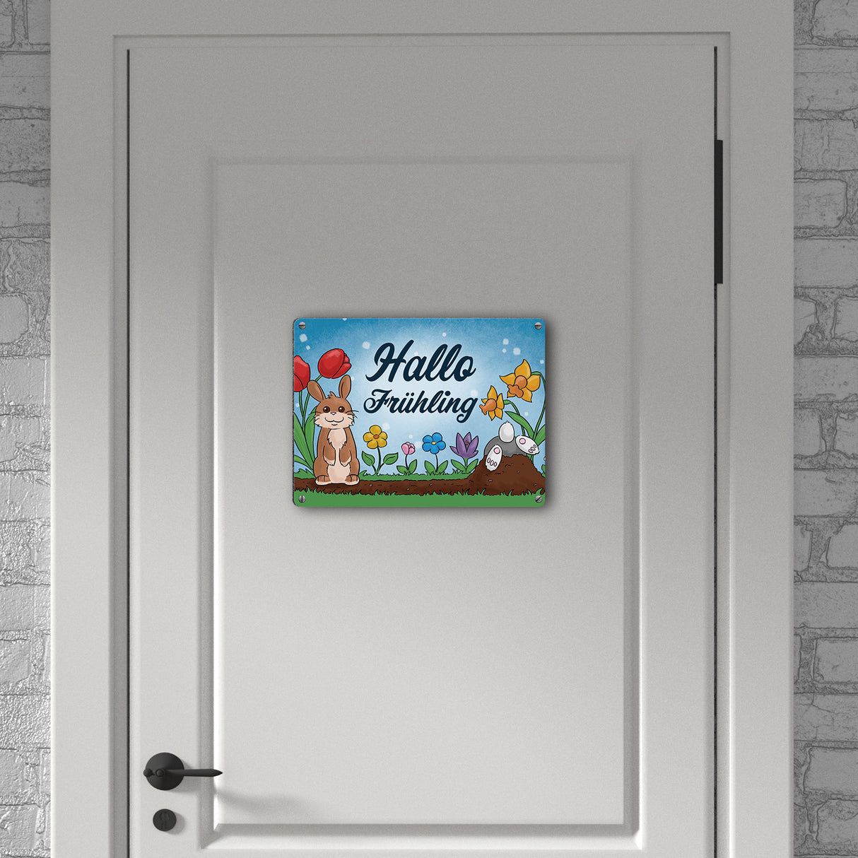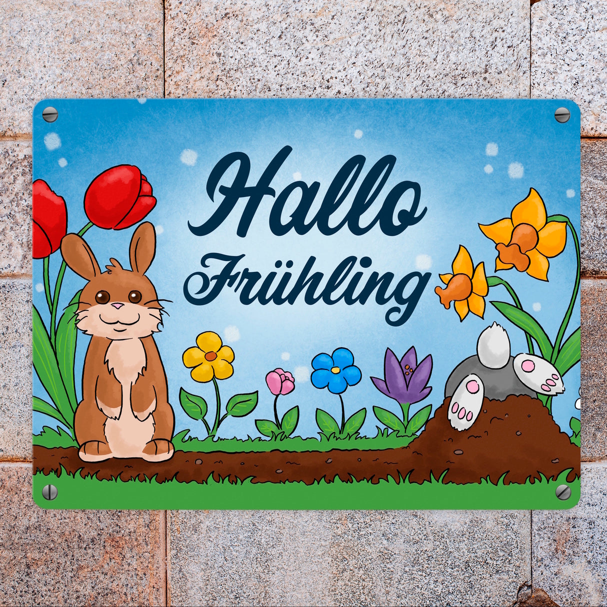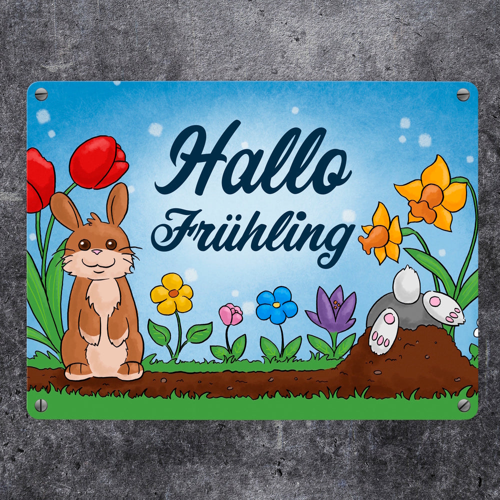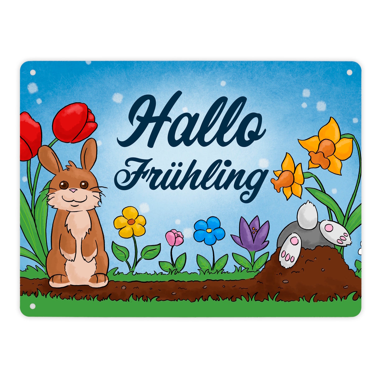 - 1x Hallo Frühling Metallschild mit süßen Hasen für Ostern in der gewählten Größe