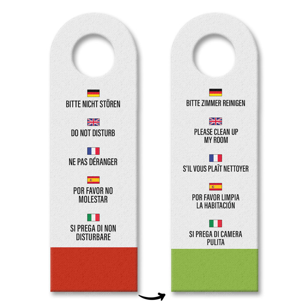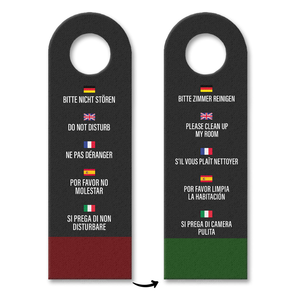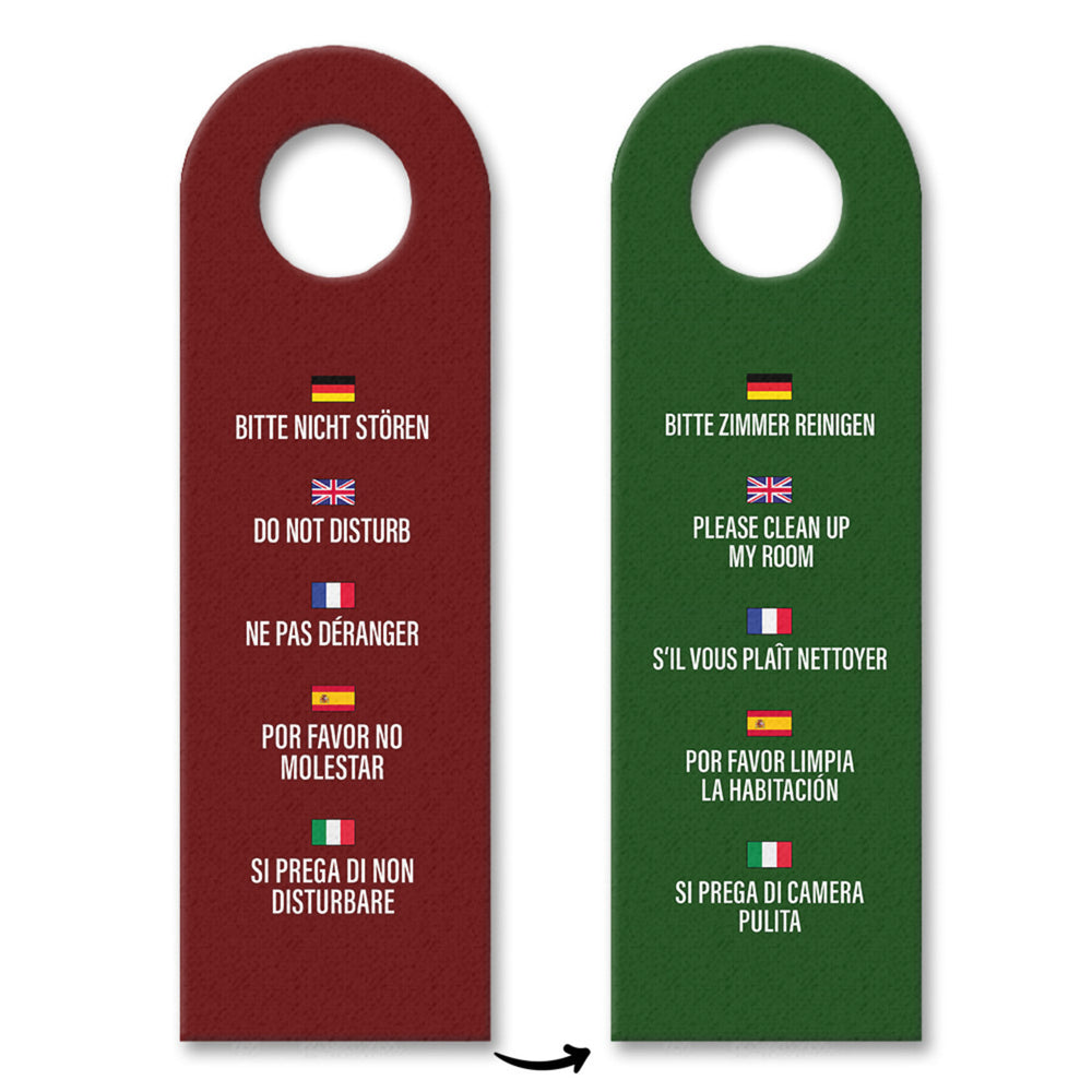 Hotel Türhänger Bitte nicht stören - Bitte Zimmer reinigen in verschiedenen Sprachen Dunkelrot und Dunkelgrün Deutsch Englisch Französisch Spanisch Italienisch Zimmerservice Zimmermädchen