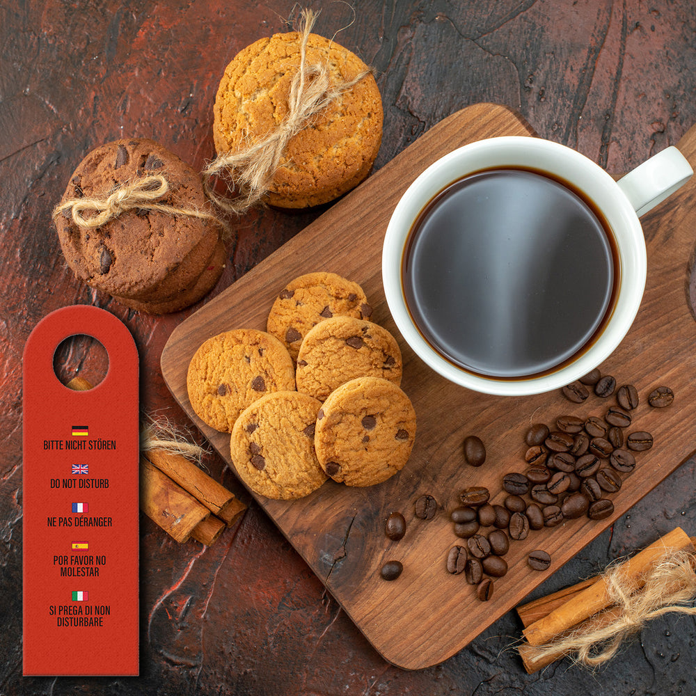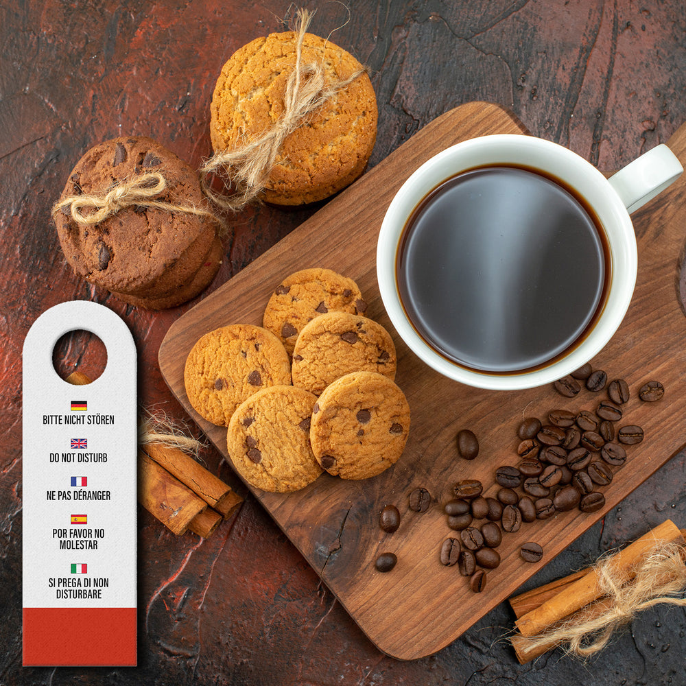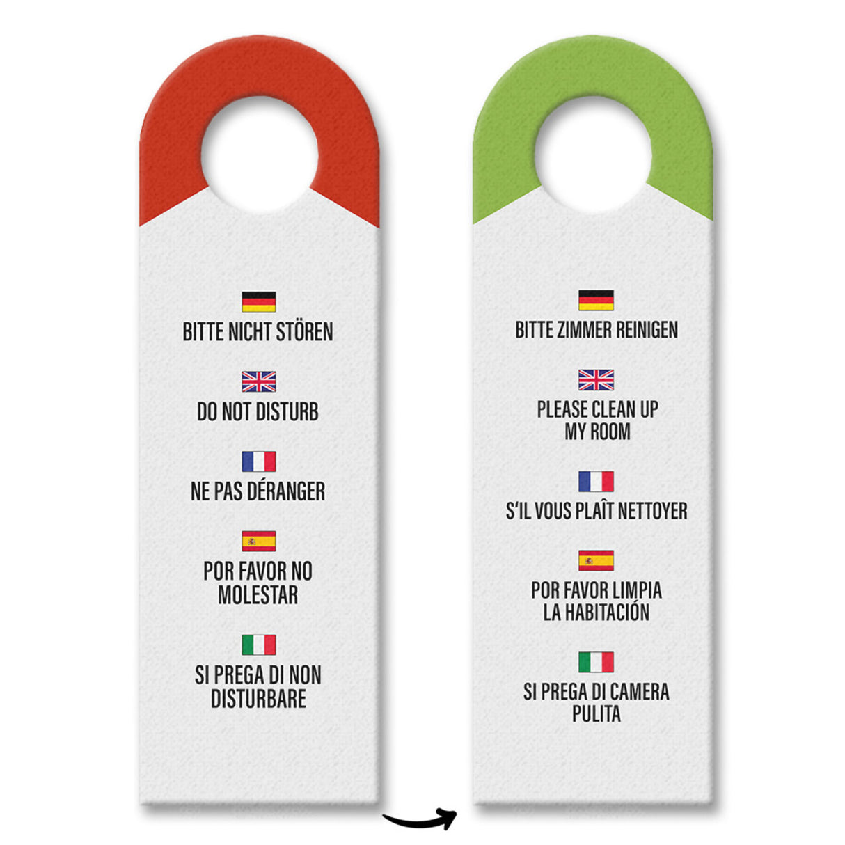 Hotel Türhänger Bitte nicht stören - Bitte Zimmer reinigen in verschiedenen Sprachen Dunkelrot und Dunkelgrün Deutsch Englisch Französisch Spanisch Italienisch Zimmerservice Zimmermädchen