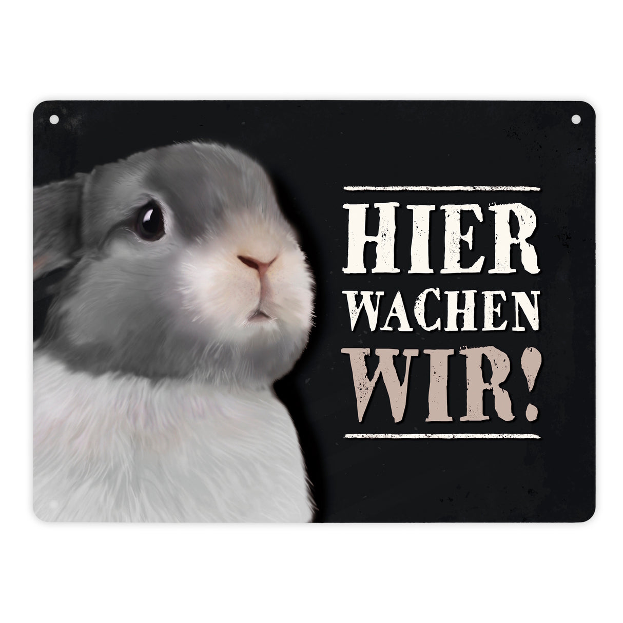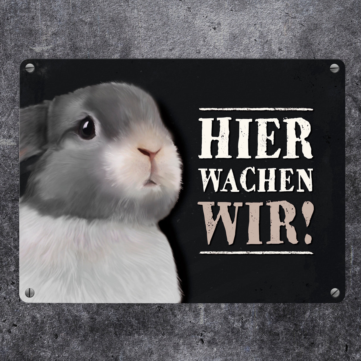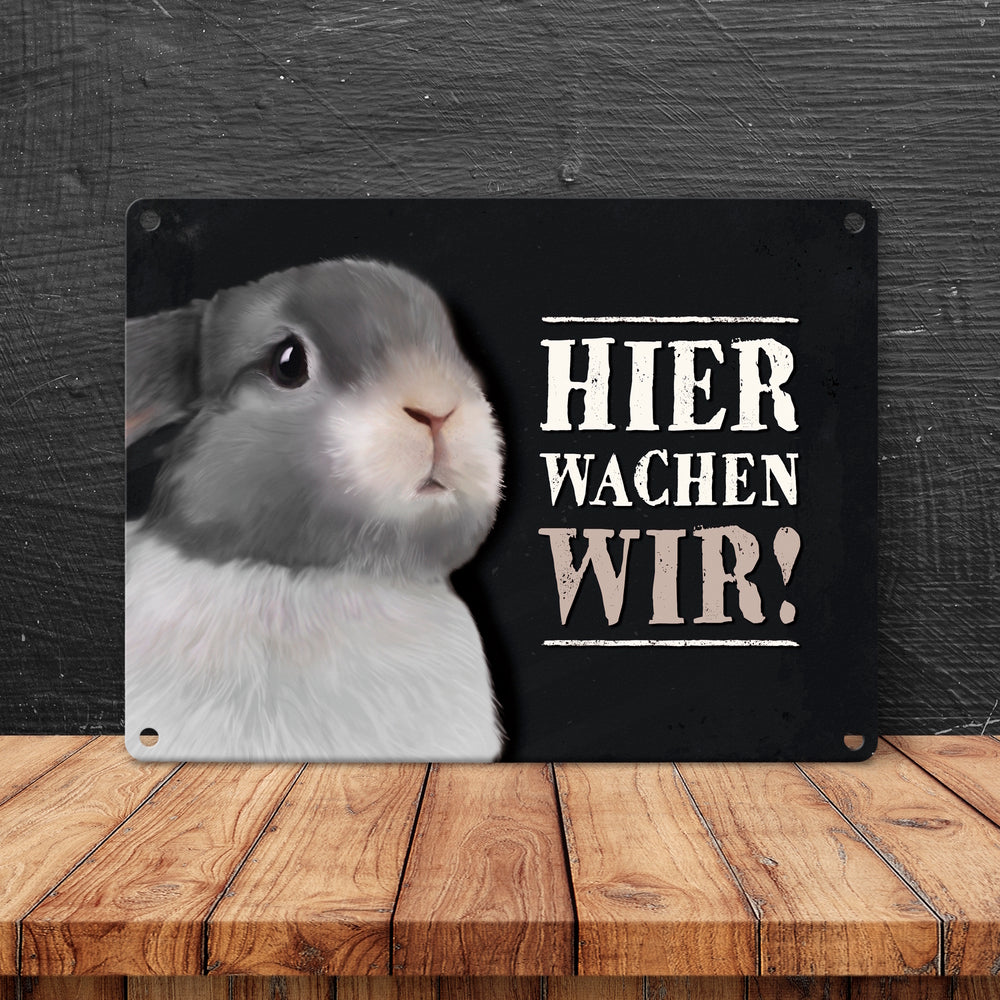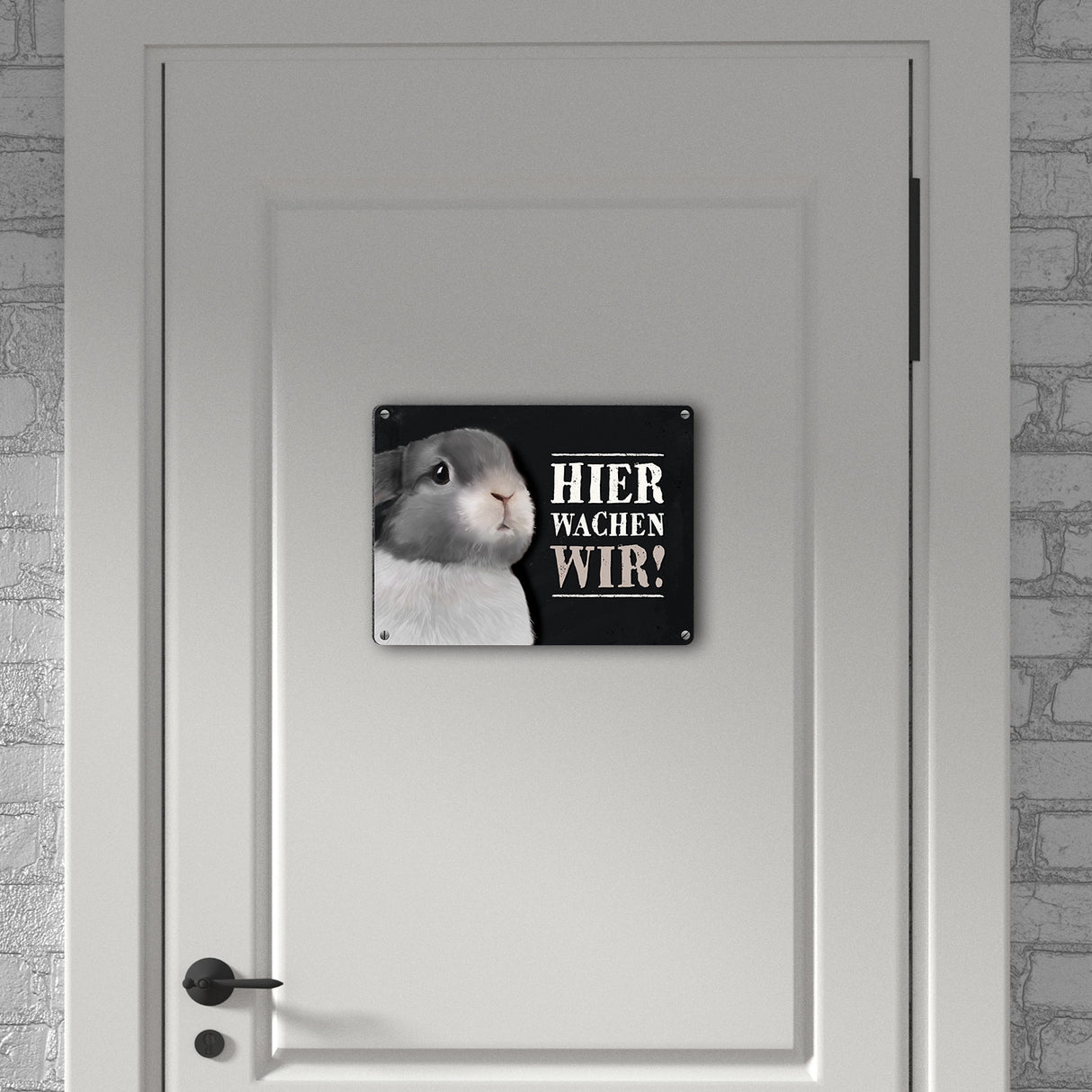 • 1x Metallschild mit Hase Motiv und Spruch: Hier wachen wir! in der gewählten Größe