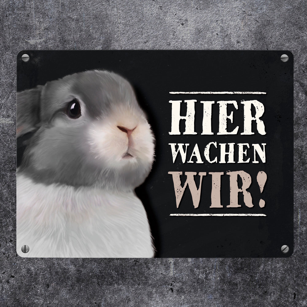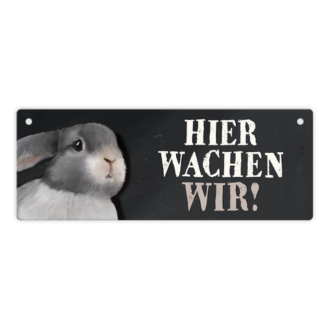 Metallschild mit Hase Motiv und Spruch: Hier wachen wir!