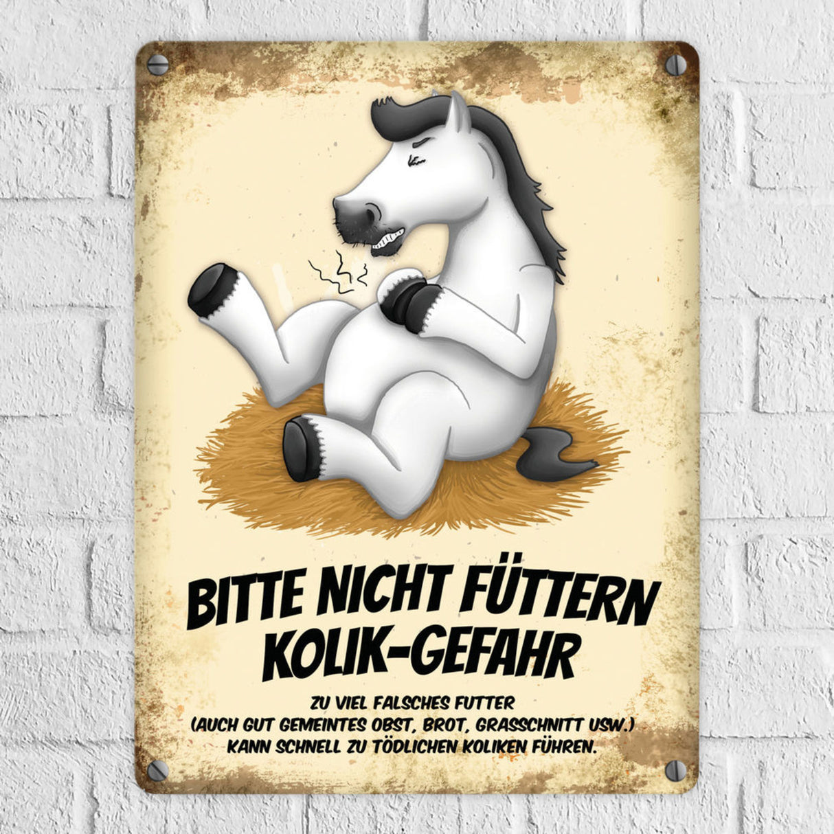 Metallschild mit weißem Pferd Motiv und Spruch: Bitte nicht füttern - Kolik-Gefahr