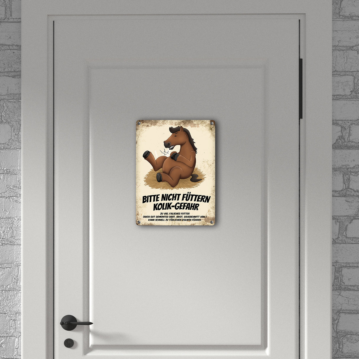 Metallschild mit braunem Pferd Motiv und Spruch: Bitte nicht füttern - Kolik-Gefahr