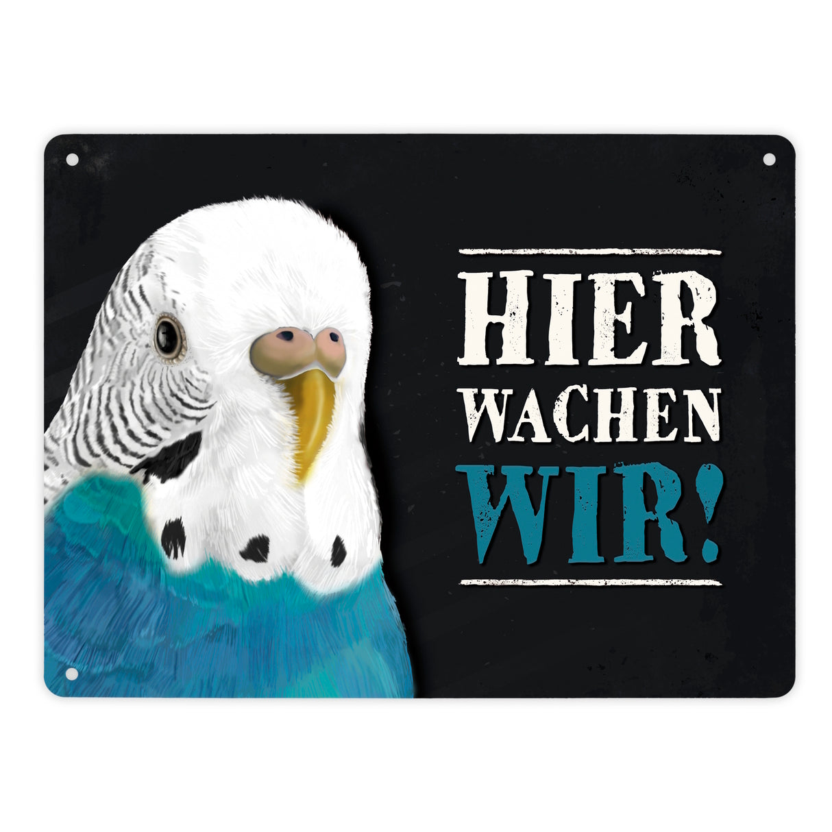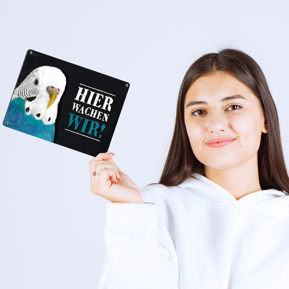 - 1x Metallschild mit Wellensittich blau Motiv und Spruch: Hier wachen wir! in der gewählten Größe