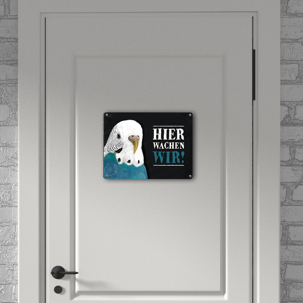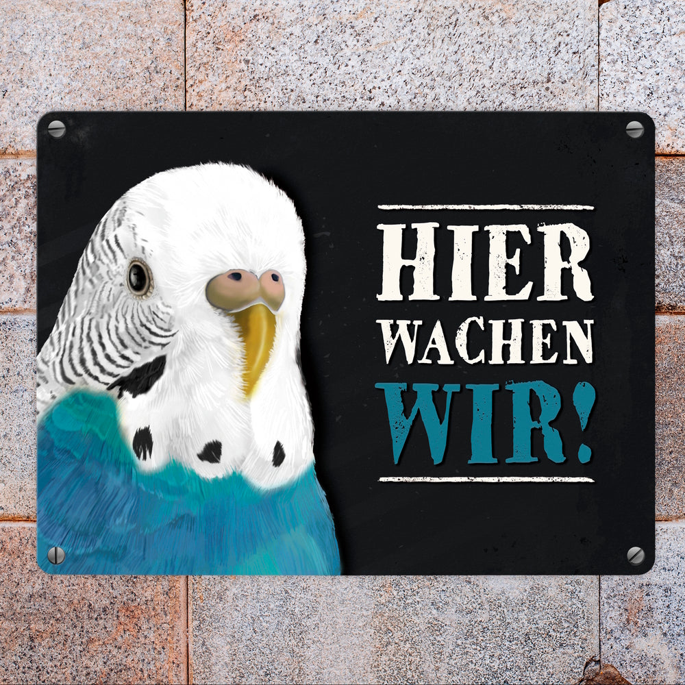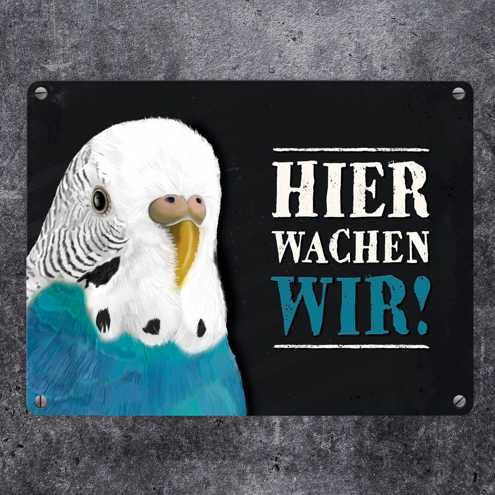 Hier wachen wir! Wellensittich Metallschild