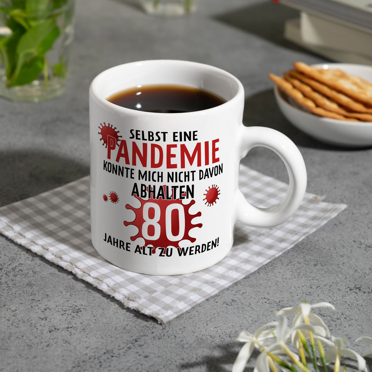 Witziger Kaffeebecher für den 80. Geburtstag mit Motiv: Pandemie