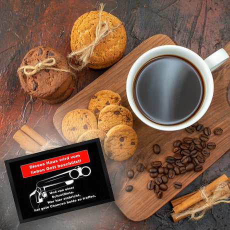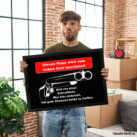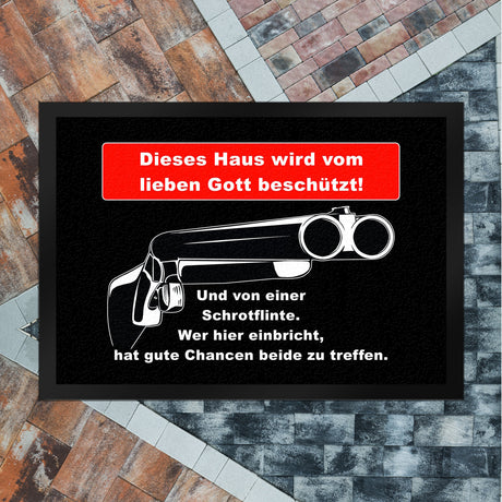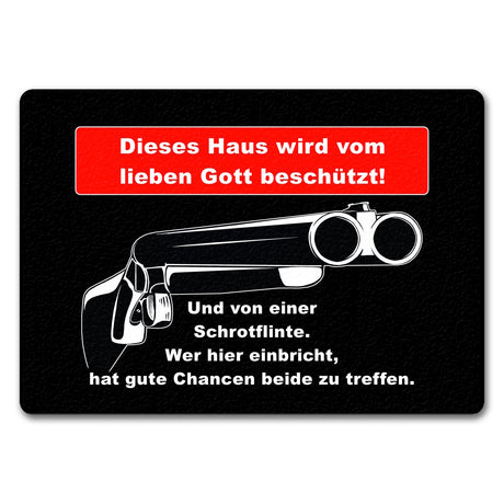 Metallschild Dieses Haus wird von Gott beschützt und einer Schrotflinte