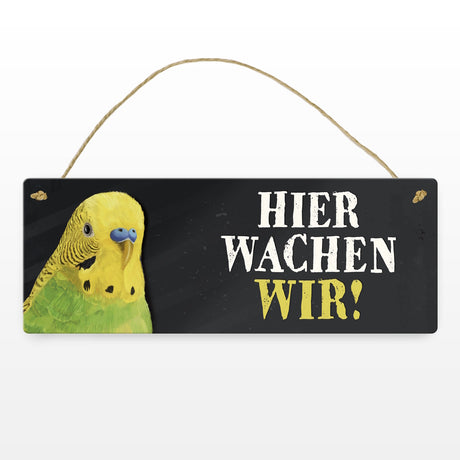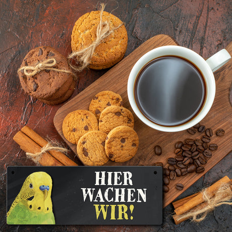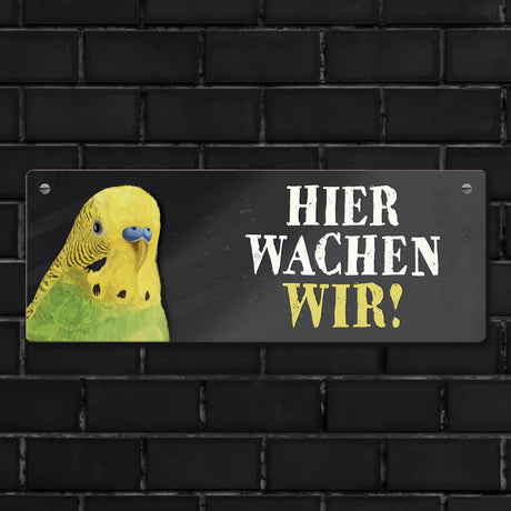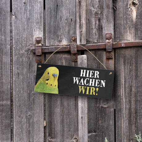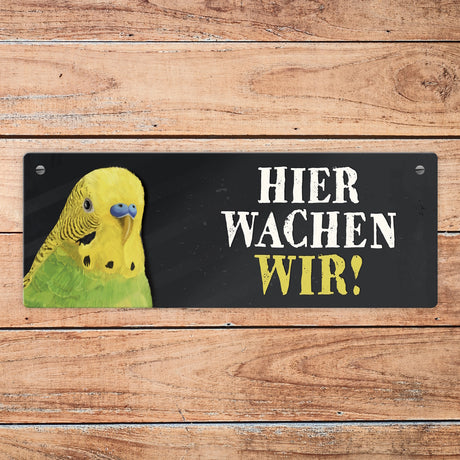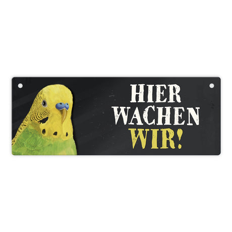 Ab €6,95Grundpreis /Nicht verfügbarAuf LagerMetallschild mit Wellensittich grün Motiv und Spruch: Hier wachen wir!