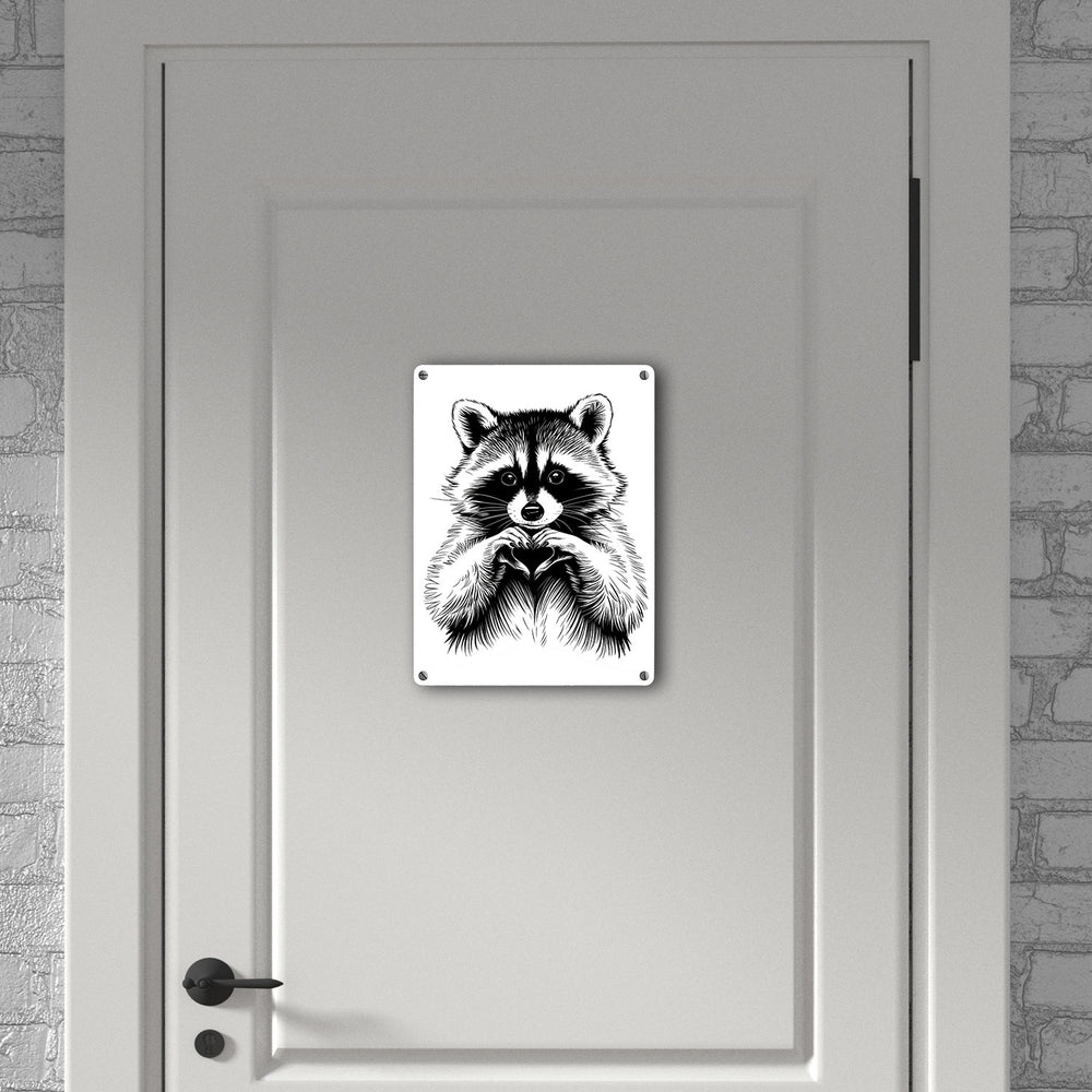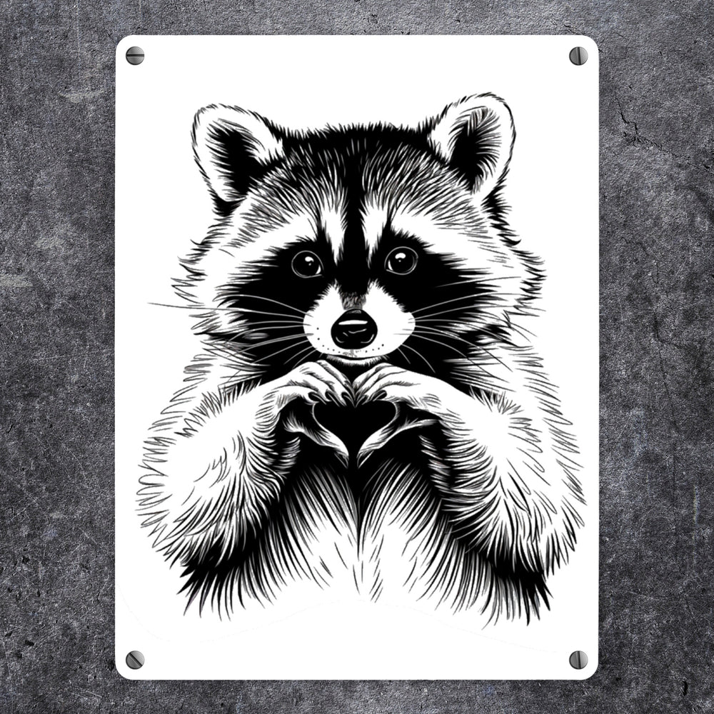 • Dieses Metallschild zeigt einen frechen Waschbären, der mit seinen flauschigen Pfoten ein Herz formt. Die detaillierte schwarz-weiße Skizze hebt die neugierigen Augen und das wuschelige Fell hervor. Ein einfach gehaltener Hintergrund sorgt dafür, dass der Waschbär im Mittelpunkt steht und sofort ins Auge fällt.