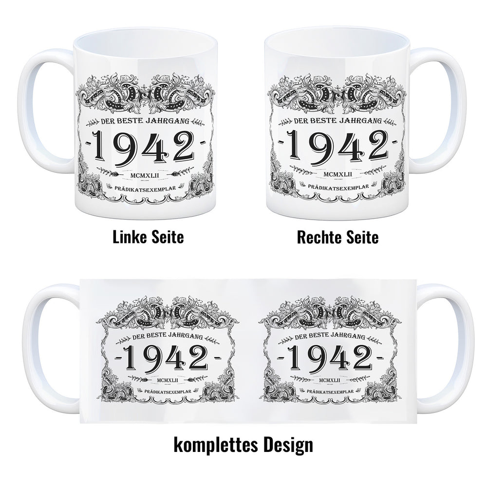 1942 ist einfach der beste Jahrgang. Aus diesem Kaffeebecher schmeckt der Morgenkaffee zeitlebens einfach am Besten! Ein tolles Geschenk zum [ber_jahrgeb]. Geburtstag Hinweise: Fassungsvermögen: ca. 300ml