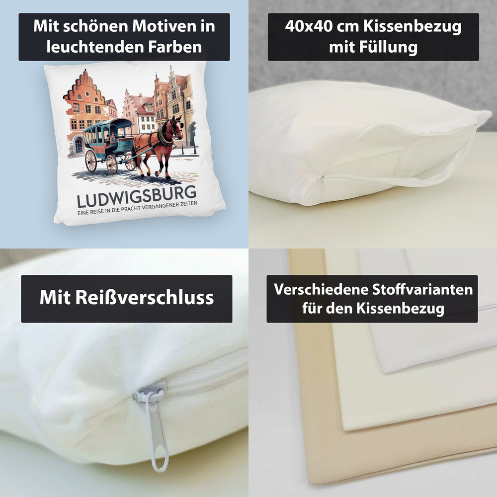 - Tauchen Sie ein in die nostalgische Atmosphäre des Ludwigsburg Reise Kissens! Ein prächtiges Design mit einer lebhaften Pferdekutsche auf Kopfsteinpflaster vor malerischen, historischen Gebäuden. Die typografischen Aquarell-Pastellfarben auf weißem Hintergrund bringen Schwung und Eleganz in Ihr Zuhause. Ein echtes Schmuckstück für jeden Raum!