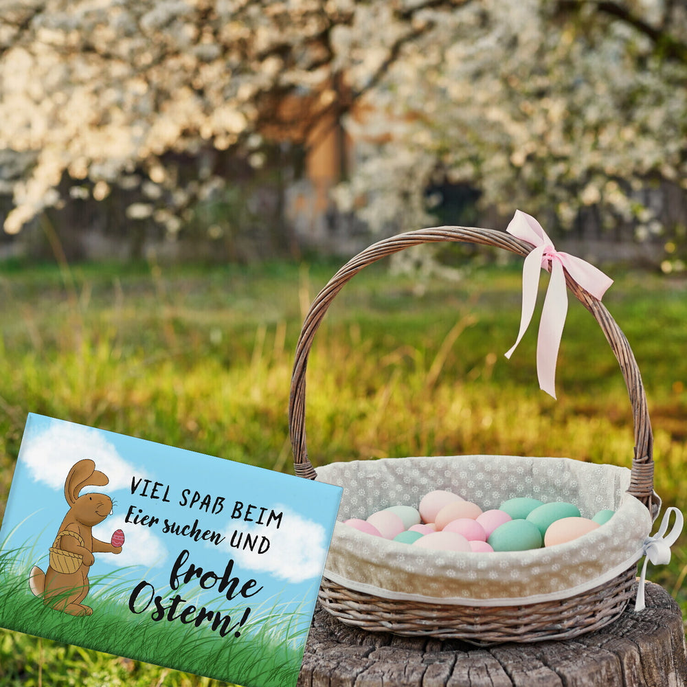 - Auf dem Magneten steht der Spruch: Viel Spaß beim Eier Suchen und frohe Ostern. Als Motiv ist ein brauner Hase mit Korb und Osterei inmitten einer Wiesenlandschaft zu sehen.