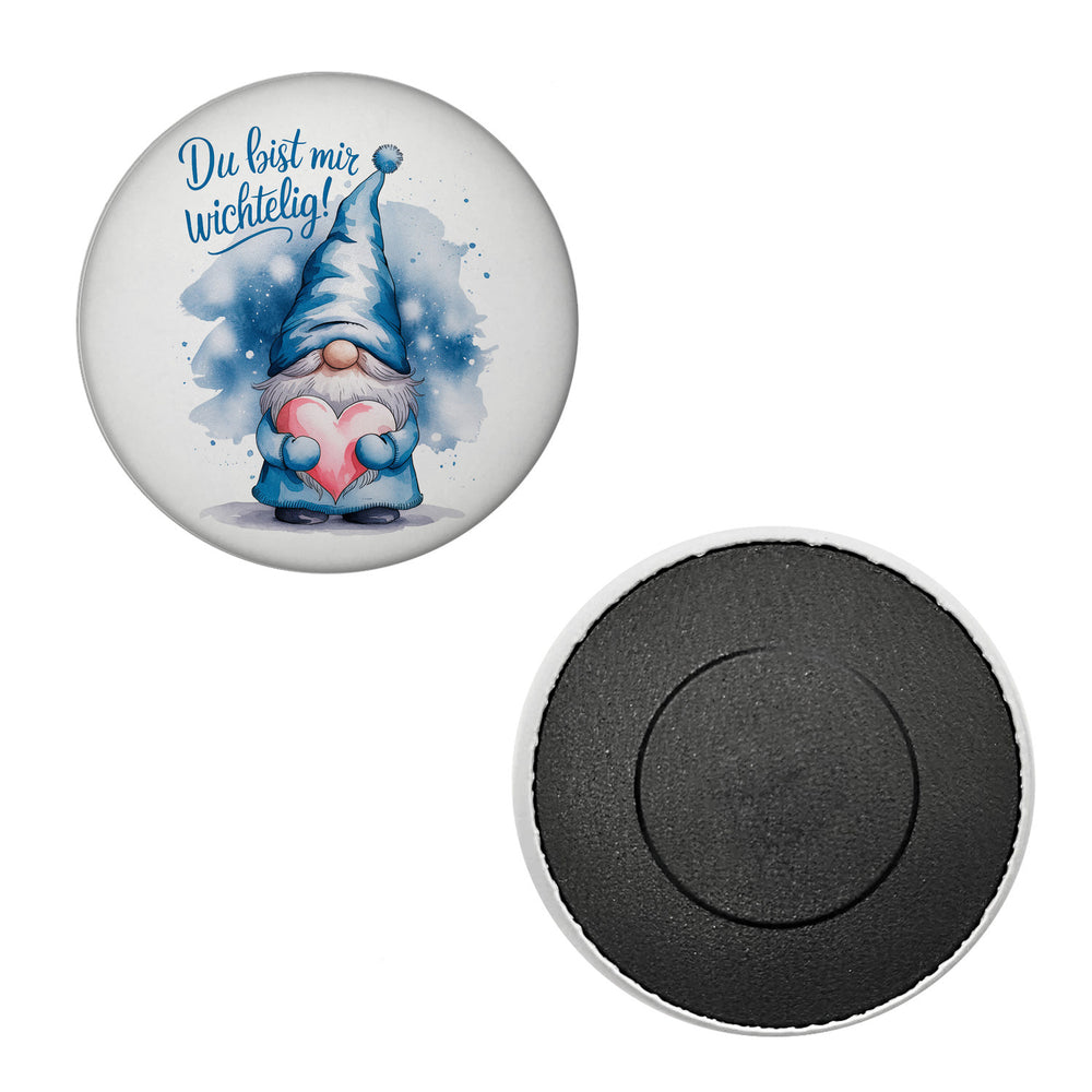 • Dieser runde Magnet zeigt einen entzückenden blauen Wichtel mit langem, spitzem Hut und weißem Bart. Seine runde Nase lugt hervor, während er innig ein herzförmiges Objekt umarmt. Der verspielte, blaue Hintergrund verleiht dem Design eine künstlerische Note. Der Wichtel-Spruch "Du bist mir wichtelig!" rundet das Motiv charmant ab.