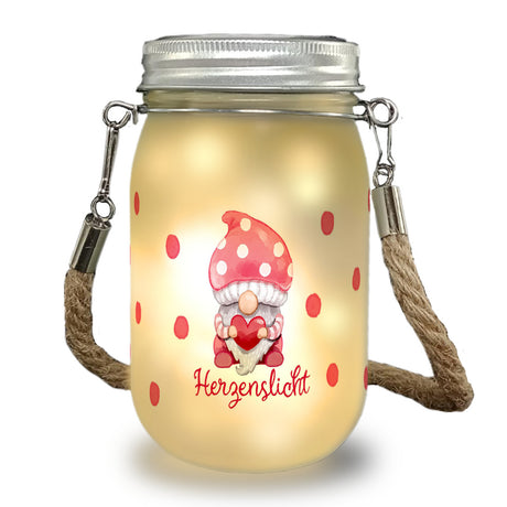 - Dieses romantische Solarlicht mit Wichtel Motiv ist ein echter Hingucker! Der niedliche Wichtel mit seiner gepunkteten Mütze und dem Herz in der Hand, bringt Liebe und Licht in jede Ecke. Das Einmachglas-Design mit Solardeckel und nostalgischem Strickhenkel macht es zur perfekten Dekolampe für Terrasse oder Wohnzimmer. Ein Muss für jeden, der es gemütlich und romantisch mag!