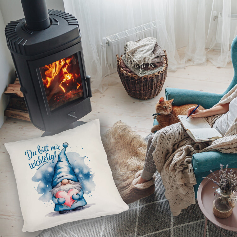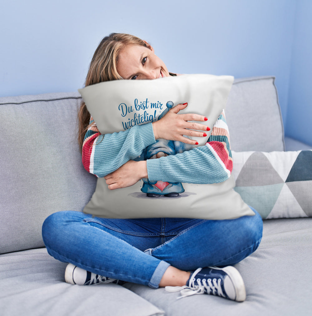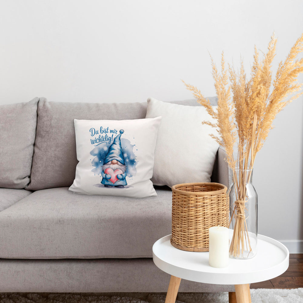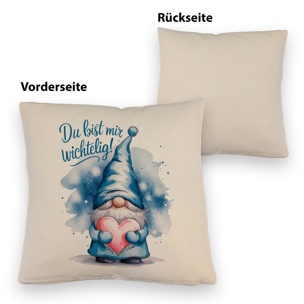 • Das Wichtel Kissen ist ein charmantes Sofakissen mit einem blauen Wichtelmotiv und dem Spruch "Du bist mir wichtelig!". Der Wichtel trägt einen langen, spitzen Hut und hält ein Herz, umgeben von einem verträumten blauen Hintergrund. Perfekt, um eine verspielte und liebevolle Atmosphäre in jedes Zuhause zu bringen.