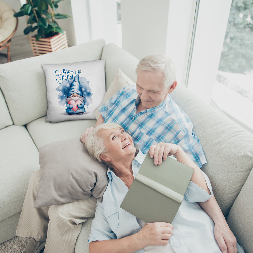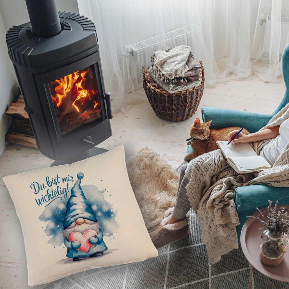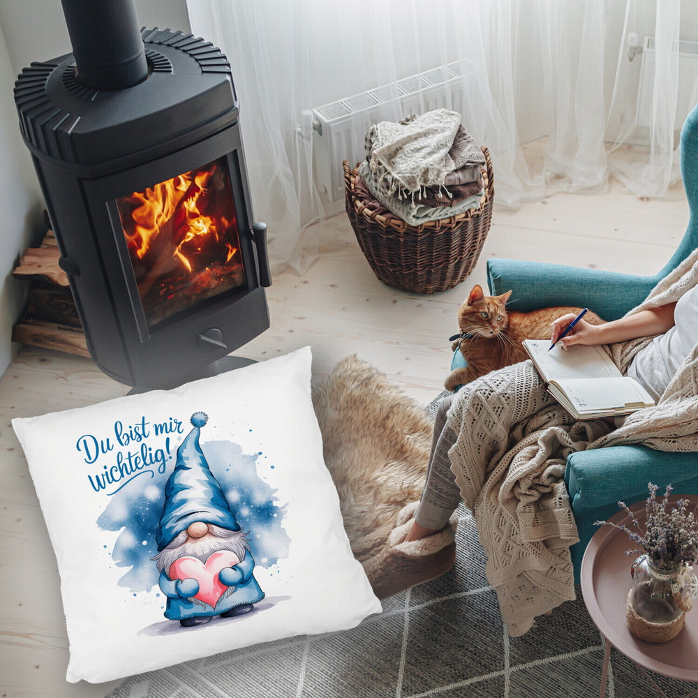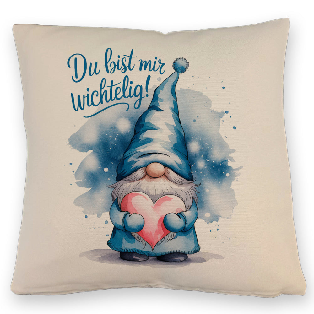 • Das Wichtel Kissen ist ein charmantes Sofakissen mit einem blauen Wichtelmotiv und dem Spruch "Du bist mir wichtelig!". Der Wichtel trägt einen langen, spitzen Hut und hält ein Herz, umgeben von einem verträumten blauen Hintergrund. Perfekt, um eine verspielte und liebevolle Atmosphäre in jedes Zuhause zu bringen.