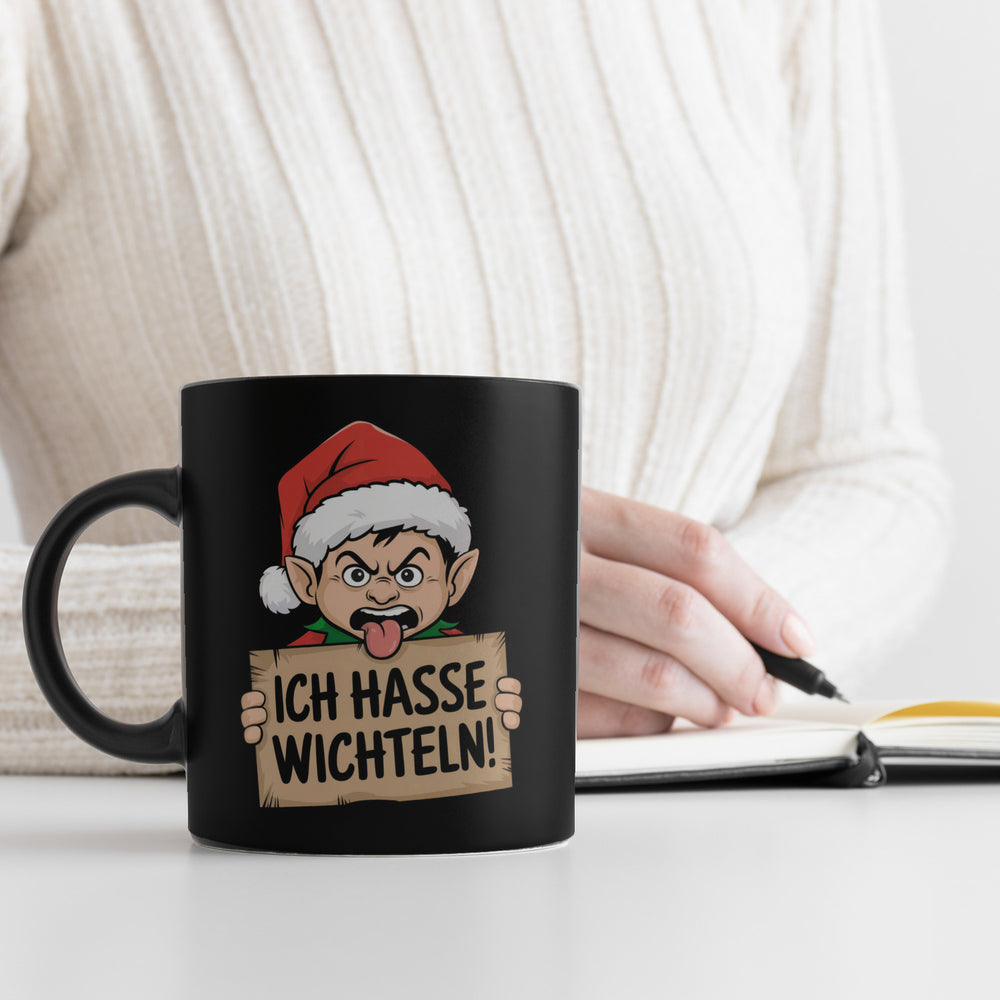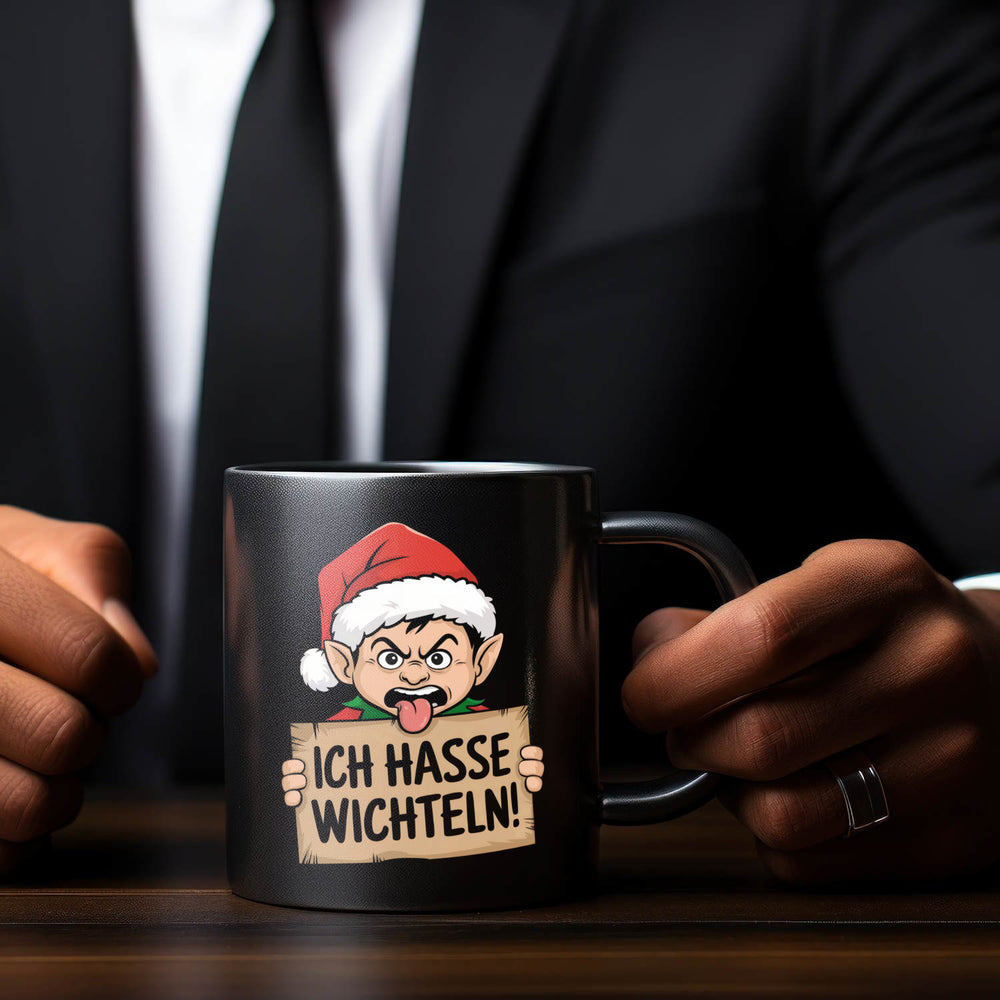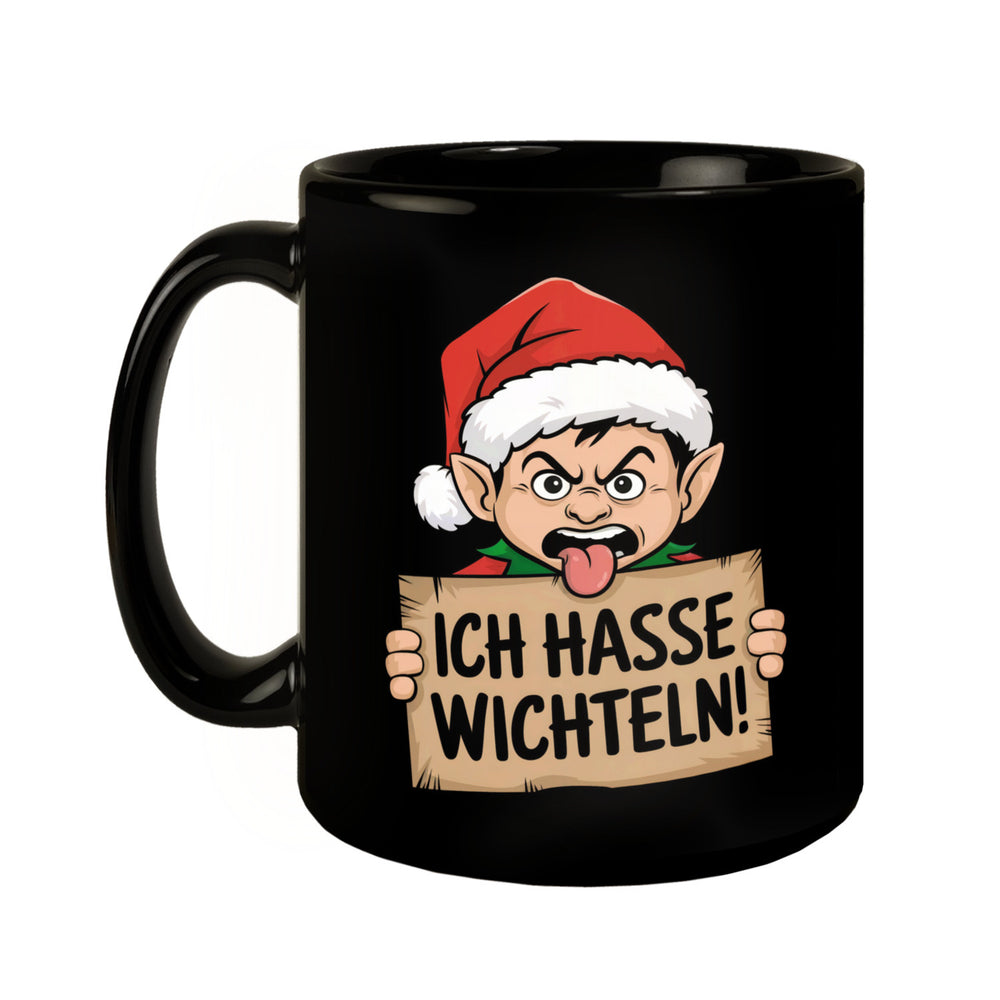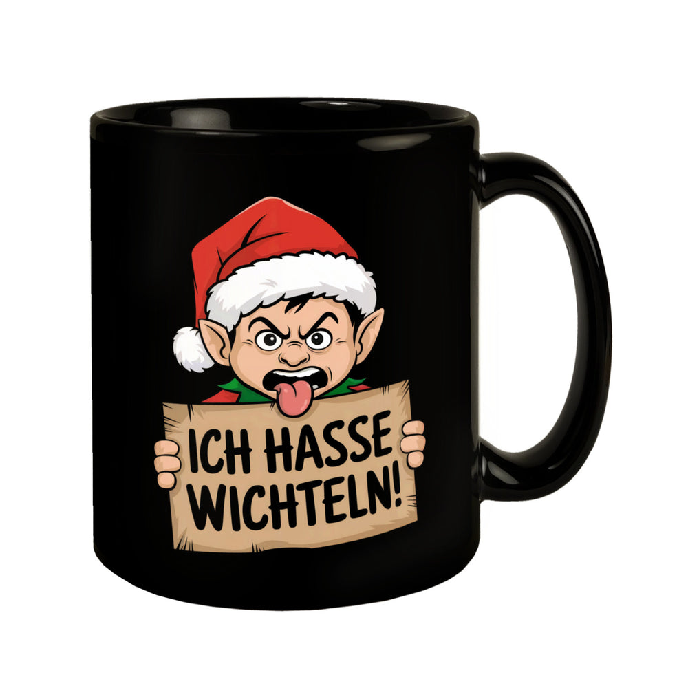 - Hey du, genug von langweiligen Kaffeetassen? Hier ist die ultimative Wichtel-Tasse! Der schwarze Kaffeebecher zeigt einen grummeligen Weihnachtswichtel mit frecher Weihnachtsmütze und herausgestreckter Zunge. Und ja, er hasst Wichteln so sehr, dass er ein Schild mit "Ich hasse Wichteln!" hochhält. Einfach köstlich komisch!
