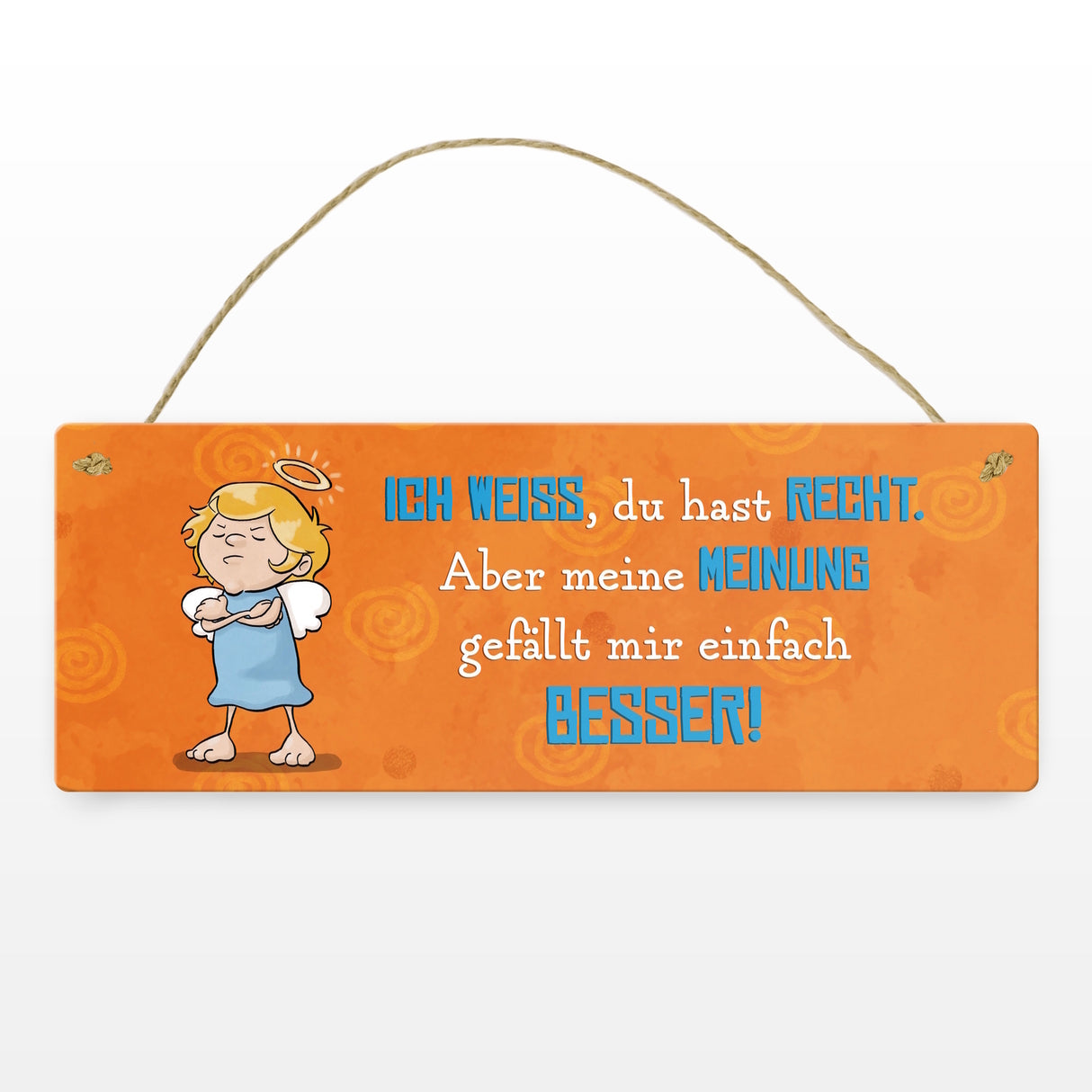 • Wenn Sie auf der Suche nach einem amüsanten und originellen Geschenk für Ihren Lieblingsscherzkeks sind, dann könnte dieses neckische Metallschild mit Engelmotiv die Lösung sein. Auf dem Artikel steht der witzige Spruch: Ich weiss, du hast Recht. Aber meine Meinung gefällt mir einfach besse.
