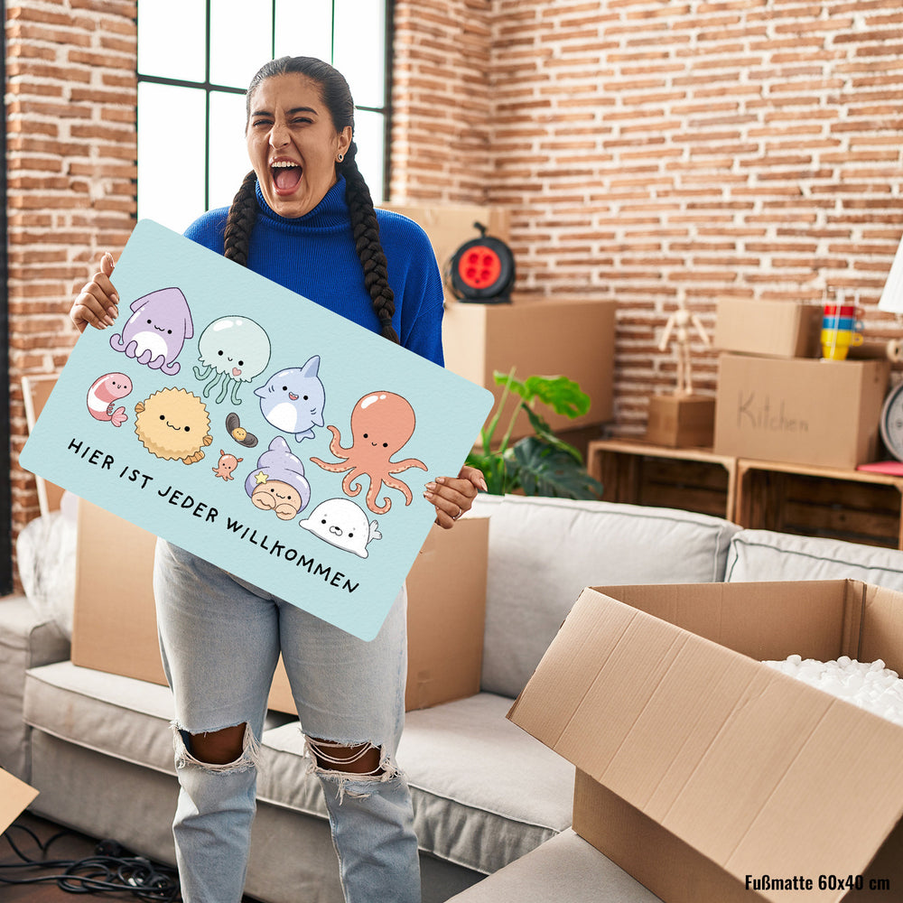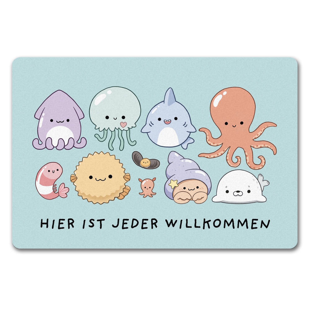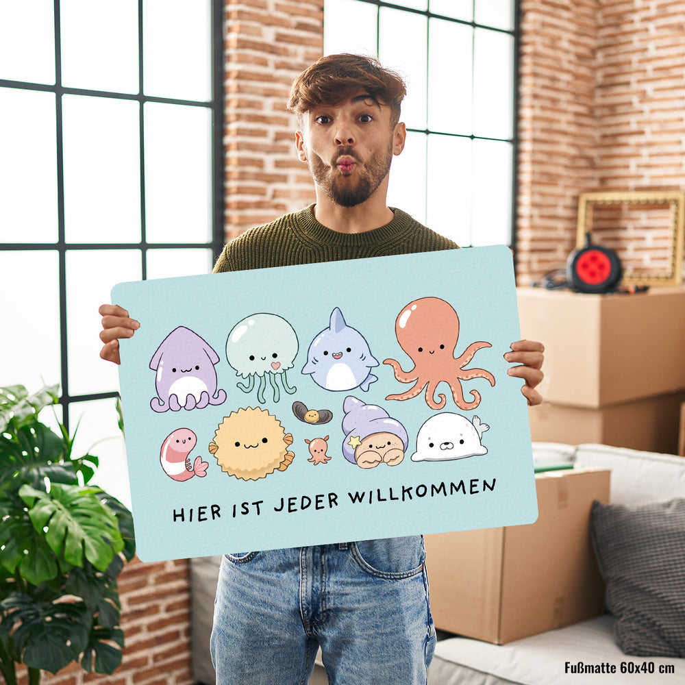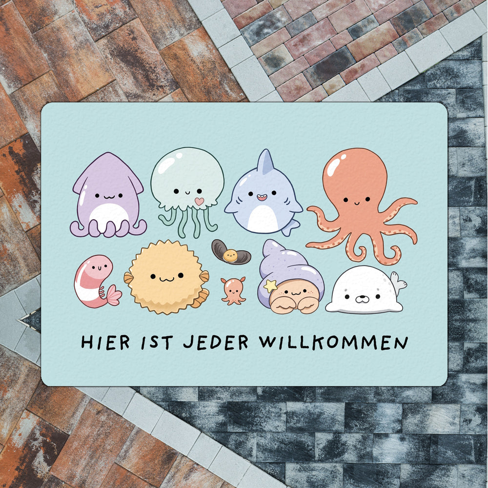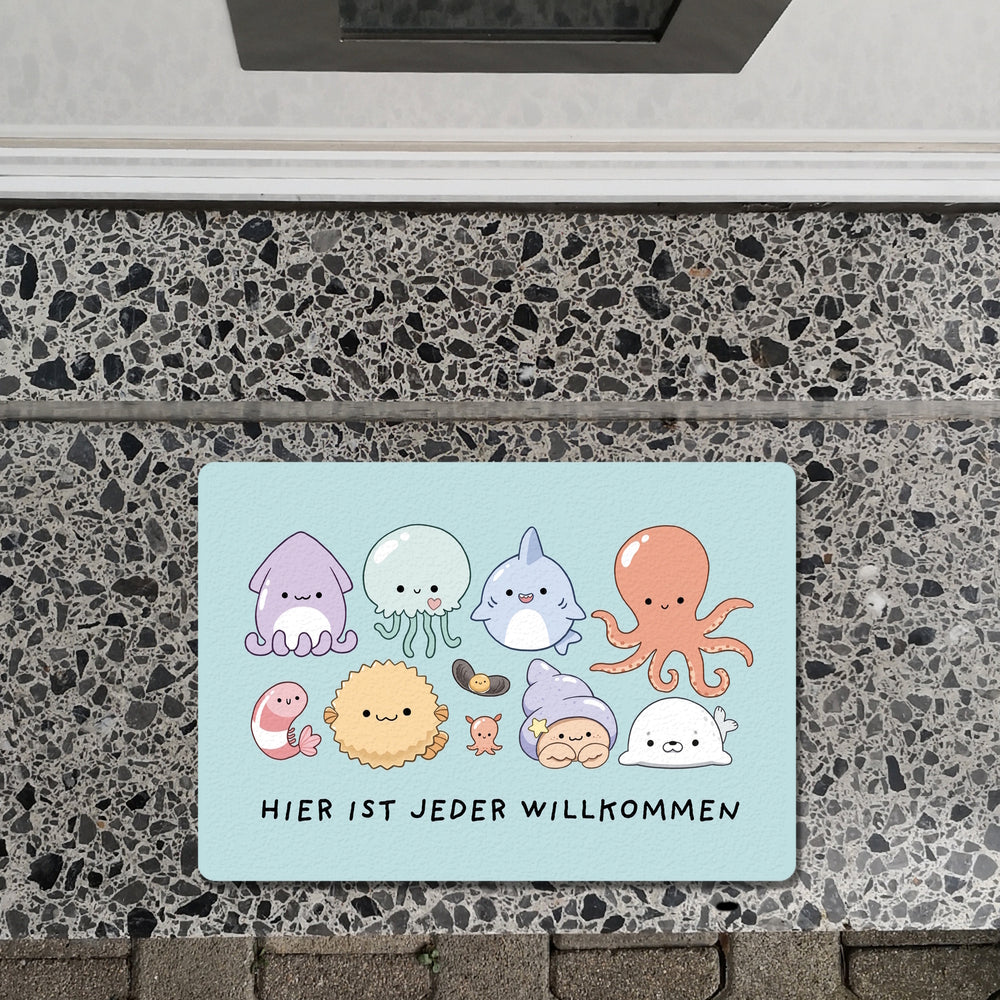 - Tretet ein in die Welt des Meereszaubers mit der Jelly Friends Fußmatte! Mit einem knuffigen Tintenfisch und seinen entzückenden Kumpels heißen wir Schuhe und Pfoten aller Art mit einem Lächeln willkommen. Wer könnte bei diesem süßen Empfangskomitee widerstehen?