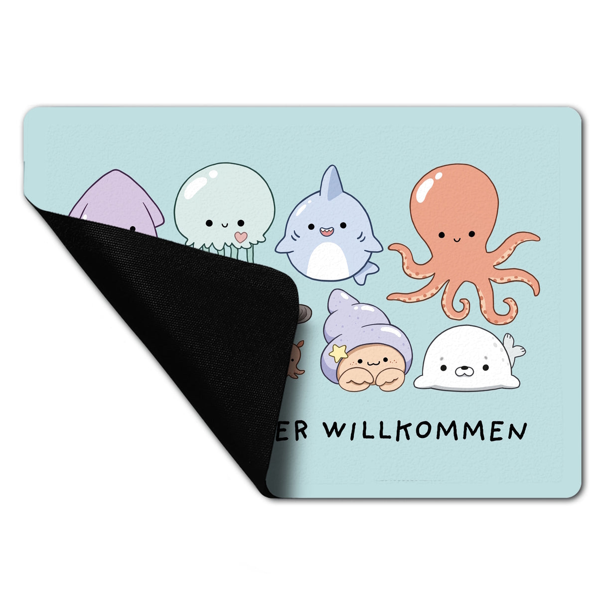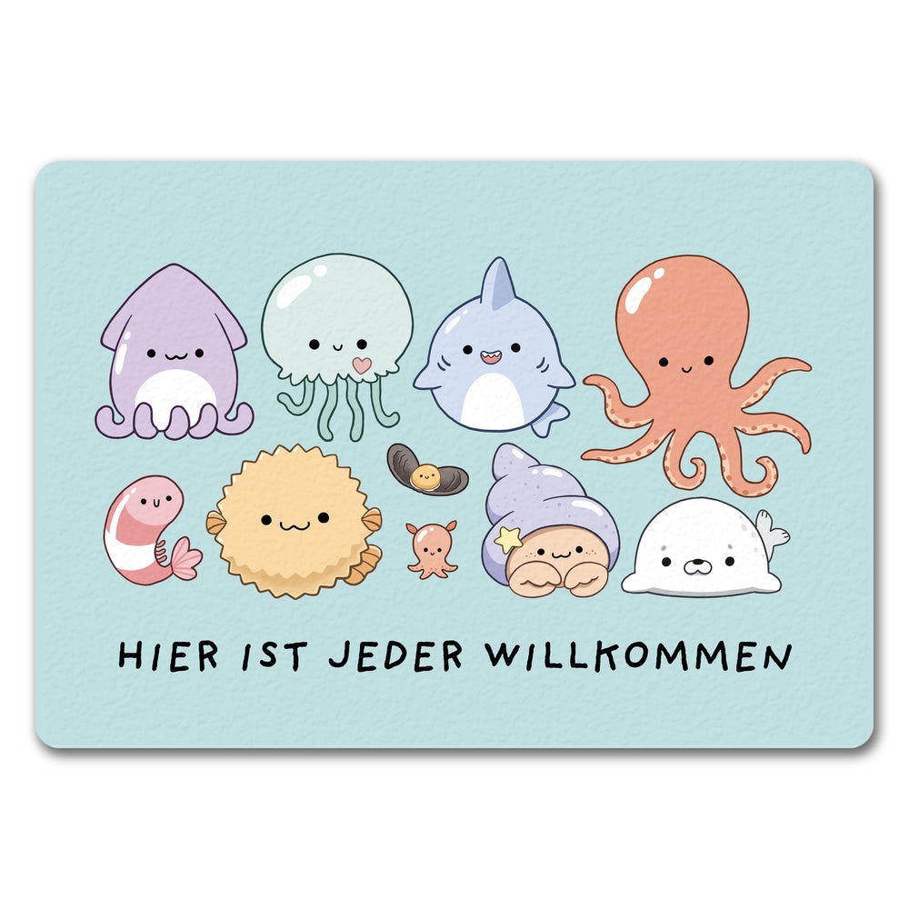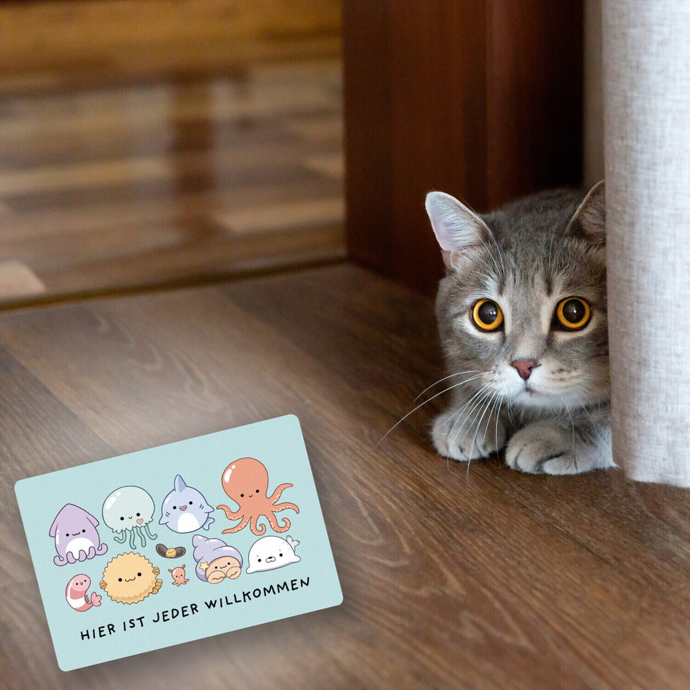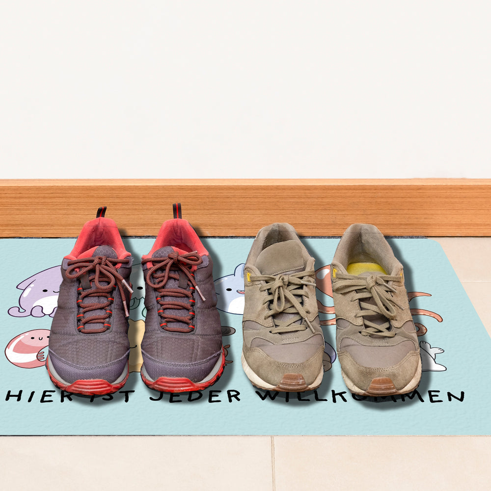 - Tretet ein in die Welt des Meereszaubers mit der Jelly Friends Fußmatte! Mit einem knuffigen Tintenfisch und seinen entzückenden Kumpels heißen wir Schuhe und Pfoten aller Art mit einem Lächeln willkommen. Wer könnte bei diesem süßen Empfangskomitee widerstehen?