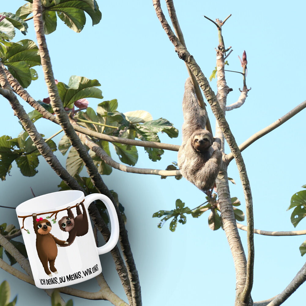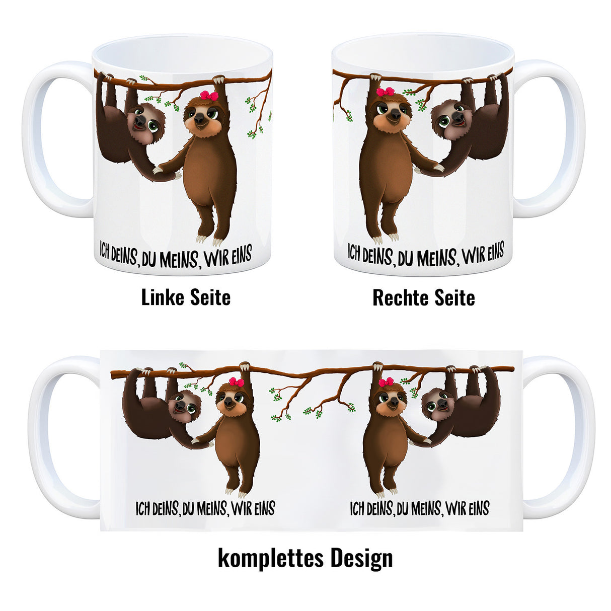Kaffeebecher mit Faultier Pärchen Motiv und Spruch: Ich deins, du meins, wir eins