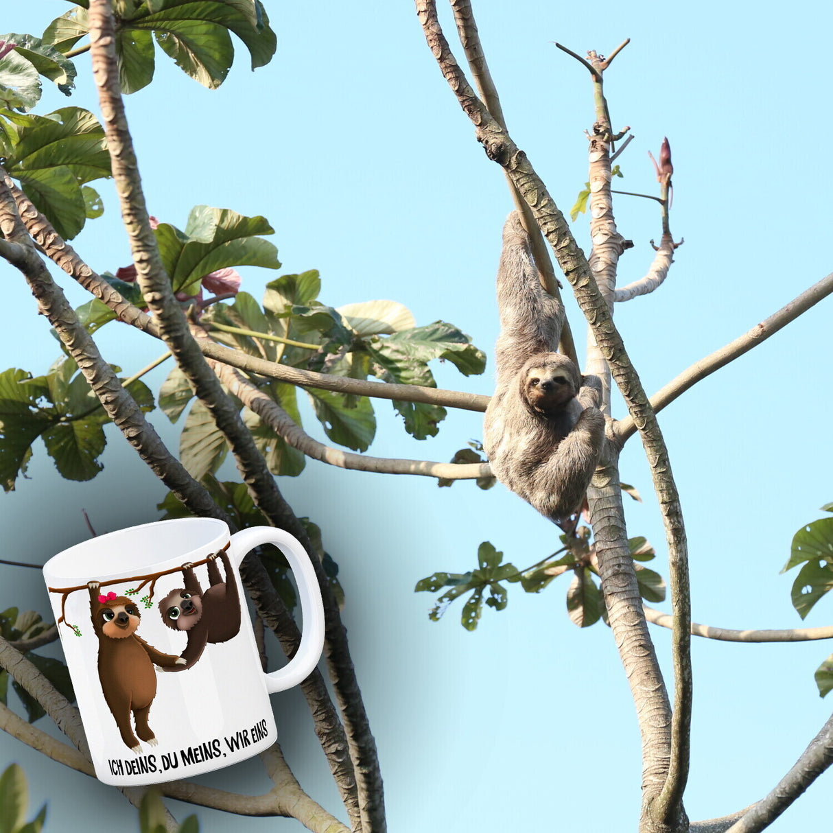 Kaffeebecher mit Faultier Pärchen Motiv und Spruch: Ich deins, du meins, wir eins ist auf Lager und wird versandt, sobald es wieder verfügbar ist