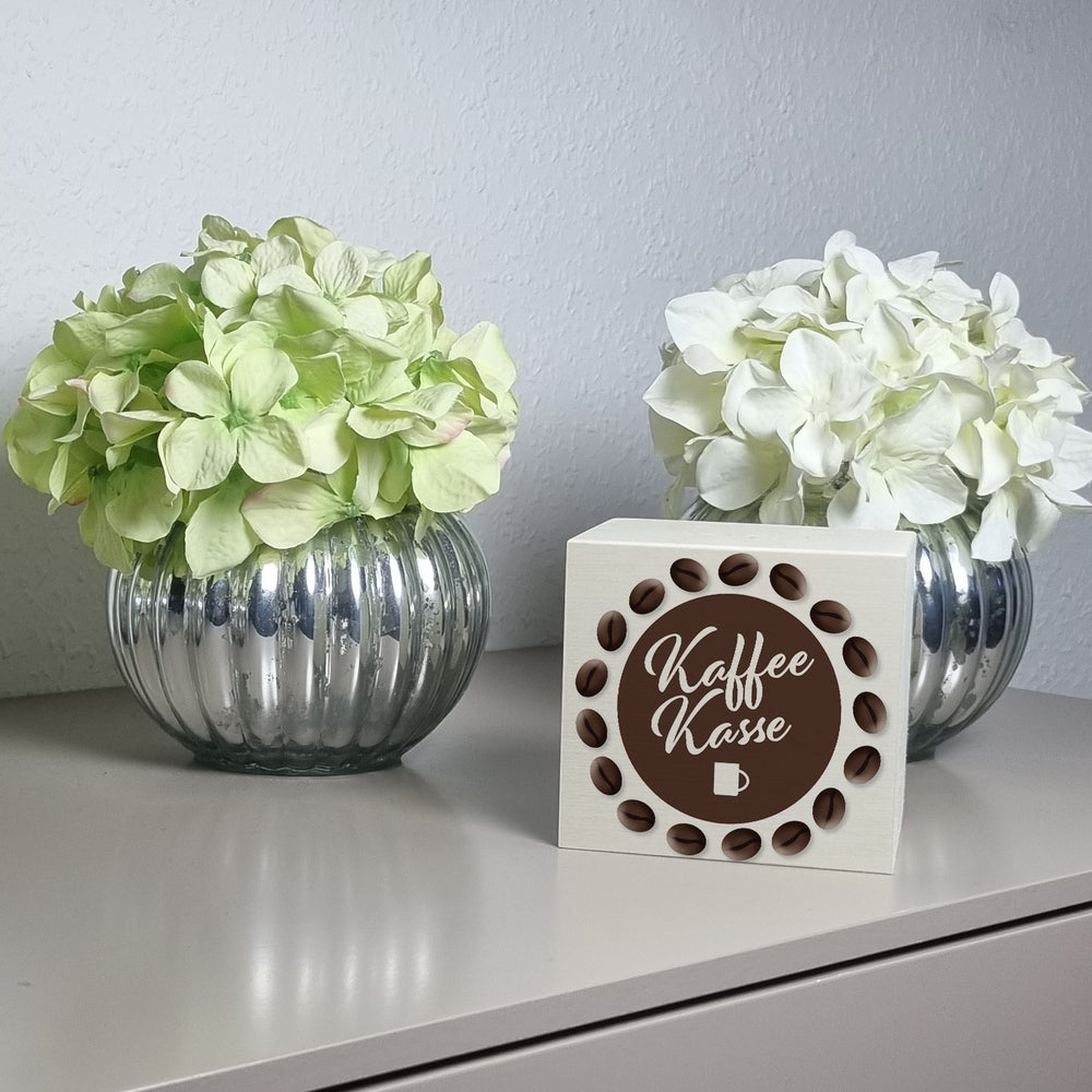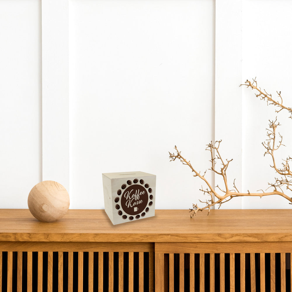 - Die Spardose mit Kaffeekassen Motiv hat auf der Oberseite einen Schlitz, um das Geld hinein zu werfen. Auf der Unterseite der Spardose befindet sich ein kleiner Stopfen zur Geldentnahme.