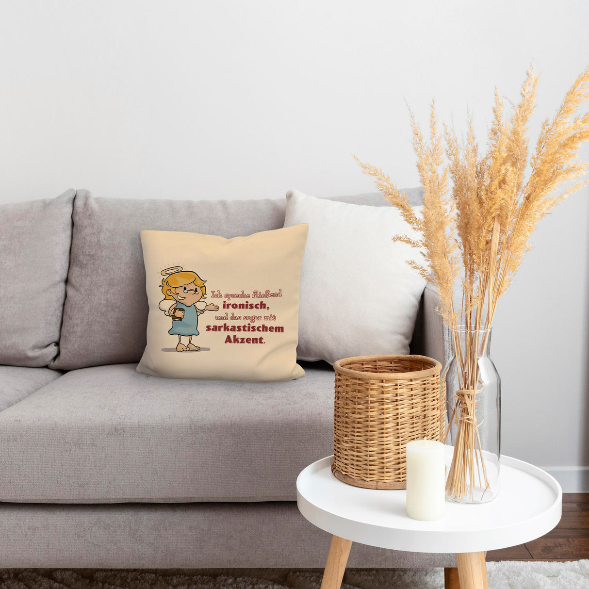 - Dieses neckische Kissen mit Engel Motiv ist eine fantastische Geschenkidee für jeden Scherzkeks zum Geburtstag. Auf dem Artikel steht der witzige und ironische Spruch: Ich spreche fließend ironisch, und das sogar mit sarkastischem Akzent. Darüber hinaus haben Sie ein schönes Dekokissen.