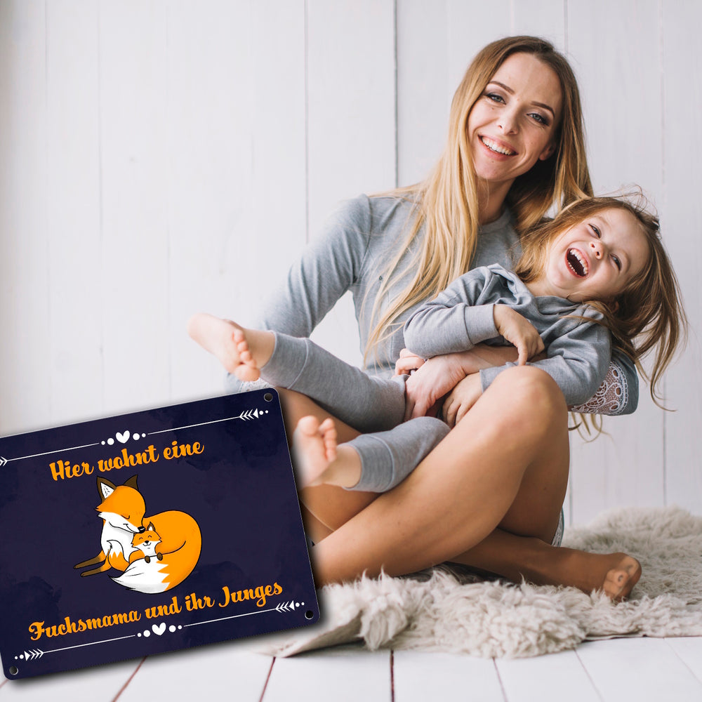 • 1x Metallschild mit Motiv und Spruch - Hier wohnt eine Fuchsmama und ihr Junges in der gewählten Größe