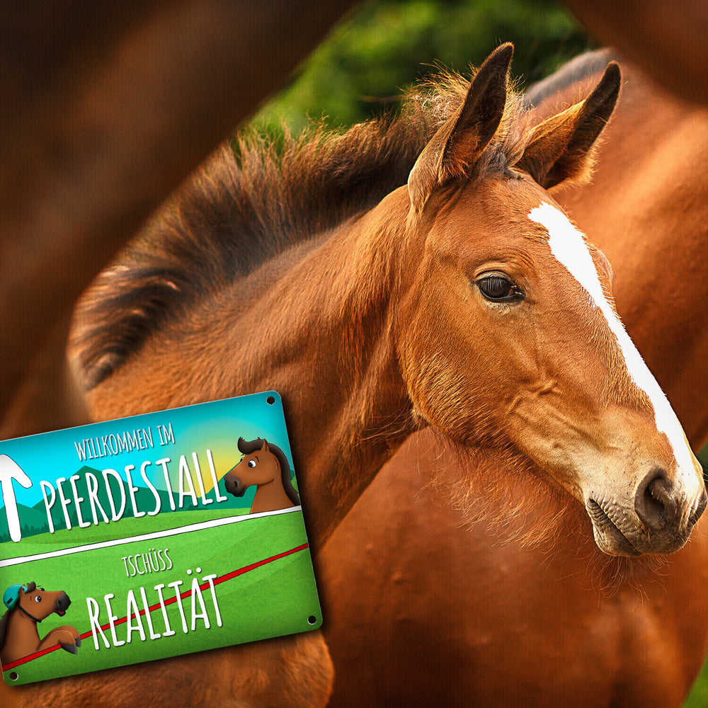 Unser Metallschild mit Pferde-Motiv und Spruch: Willkommen im Pferdestall ist der perfekte Begleiter für jeden, der sich in die Welt des Reitens stürzen möchte. Der hochwertige Aluminiumblech-Druck in den Größen 15x20cm, 21x28cm und 28x38cm ist eine schöne Erinnerung an das wundervolle Leben im Stall und zaubert jedem Betrachter ein Lächeln ins Gesicht. Mit vorgebohrten Löchern und abgerundeten Ecken in Handarbeit hergestellt, erfreut sich unser Metallschild großer Beliebtheit. Willkommen im Pferdestall - Tschüss Realität!