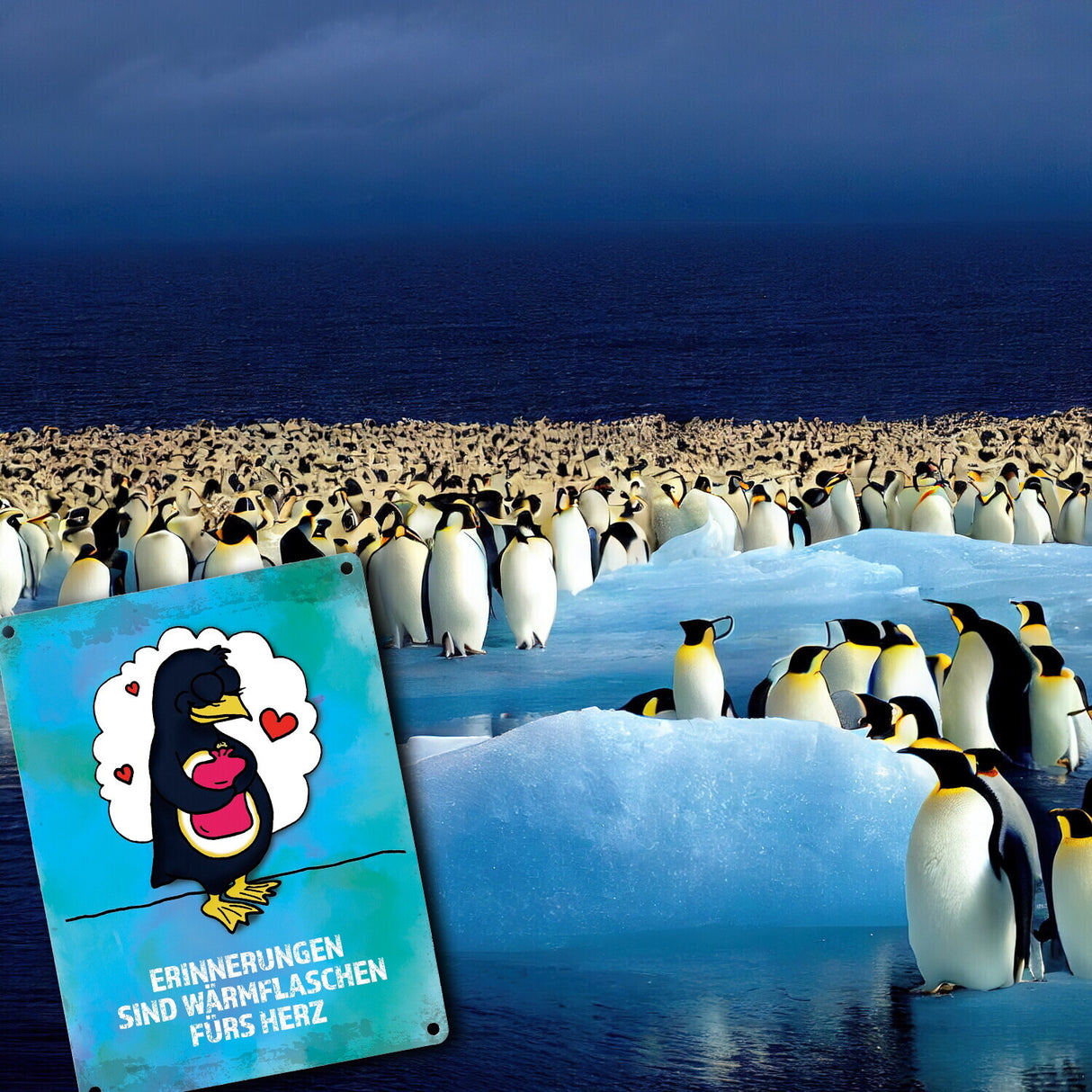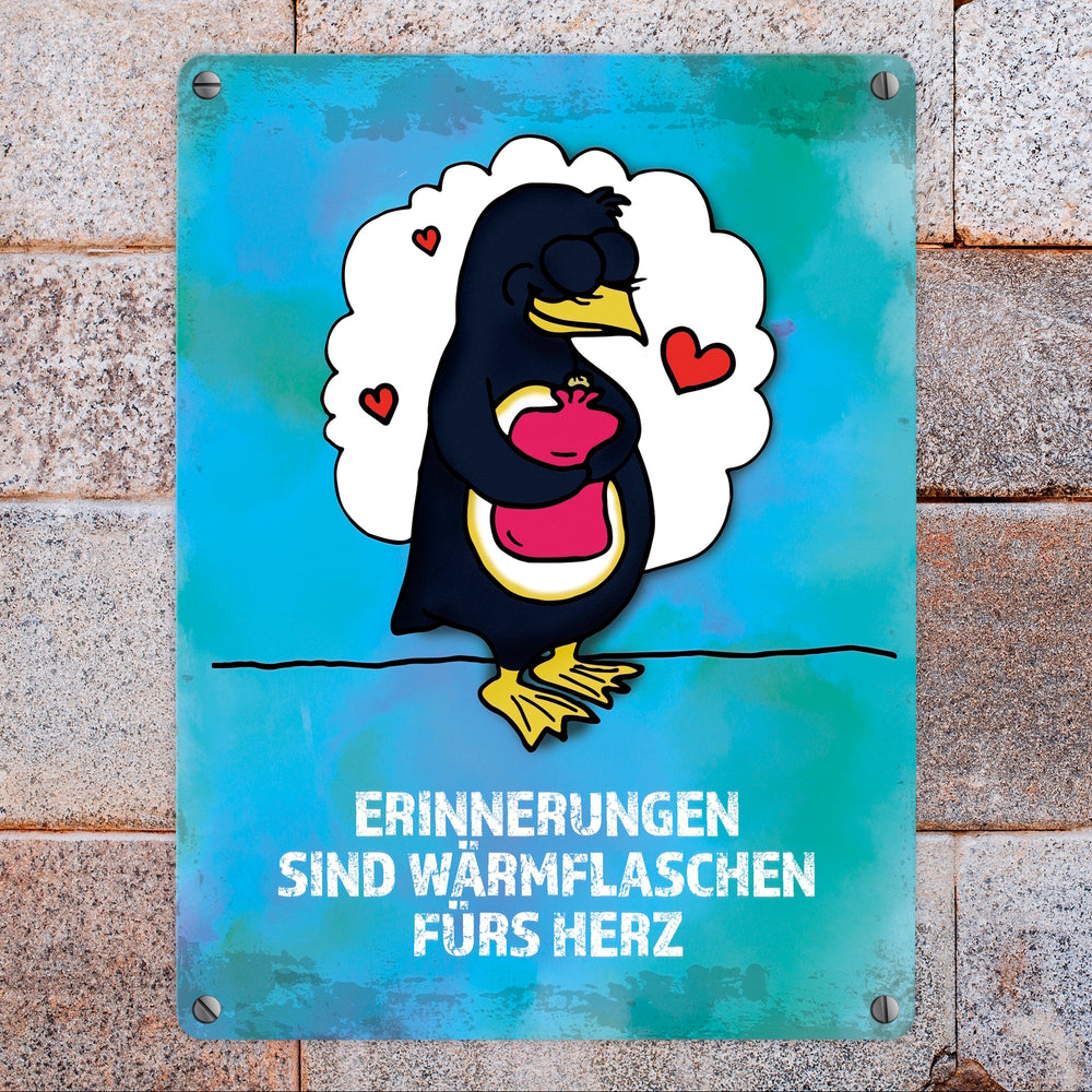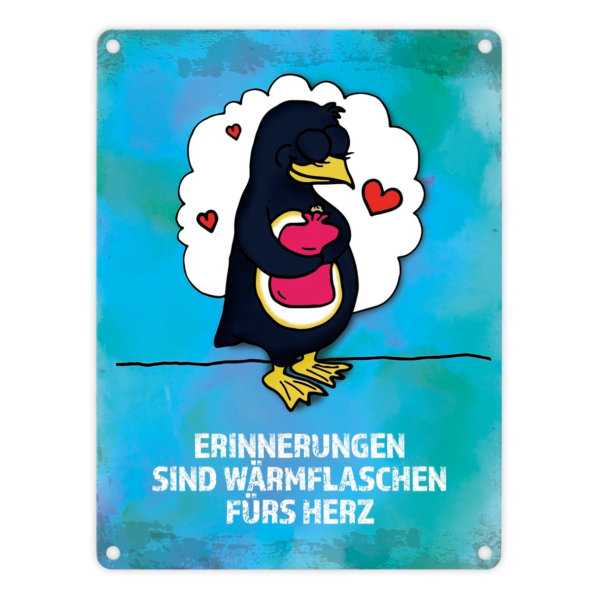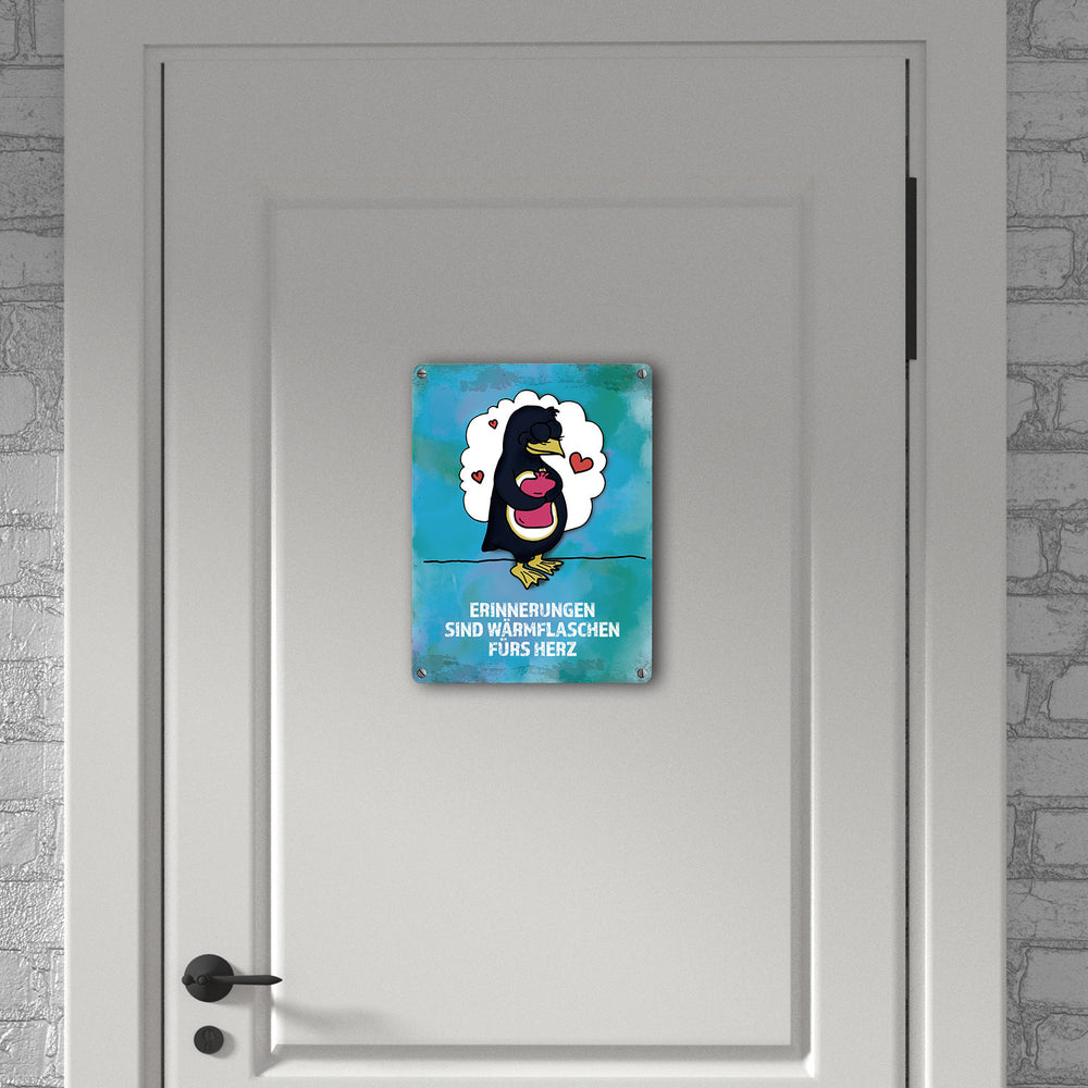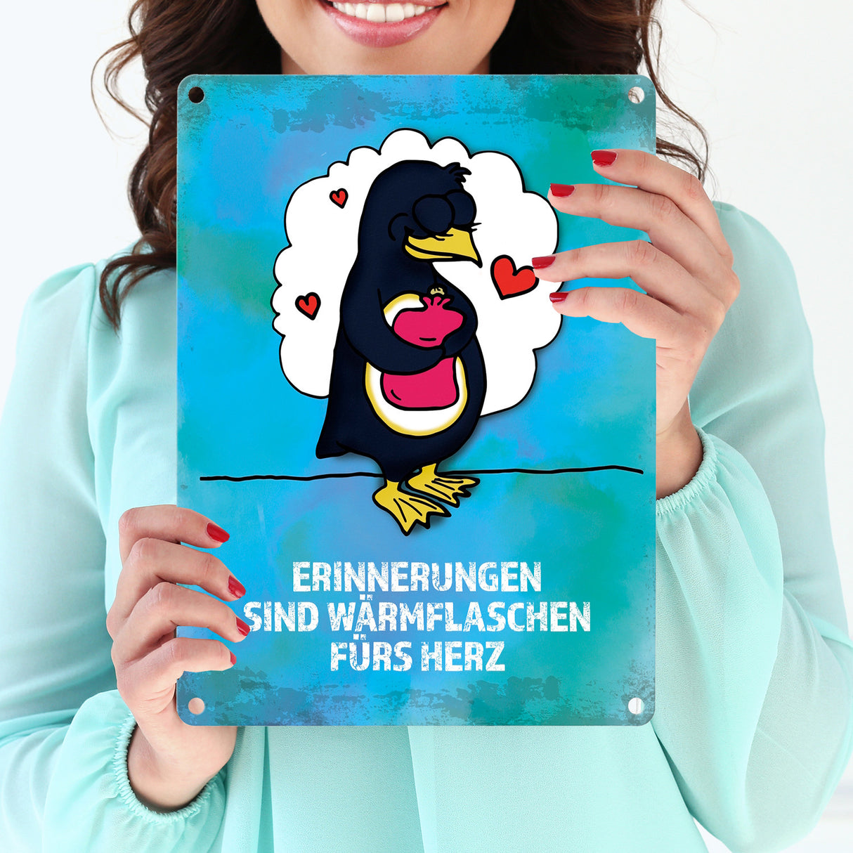 - 1x Metallschild mit Pinguin Motiv und Spruch: Erinnerungen sind Wärmflaschen ... in der gewählten Größe